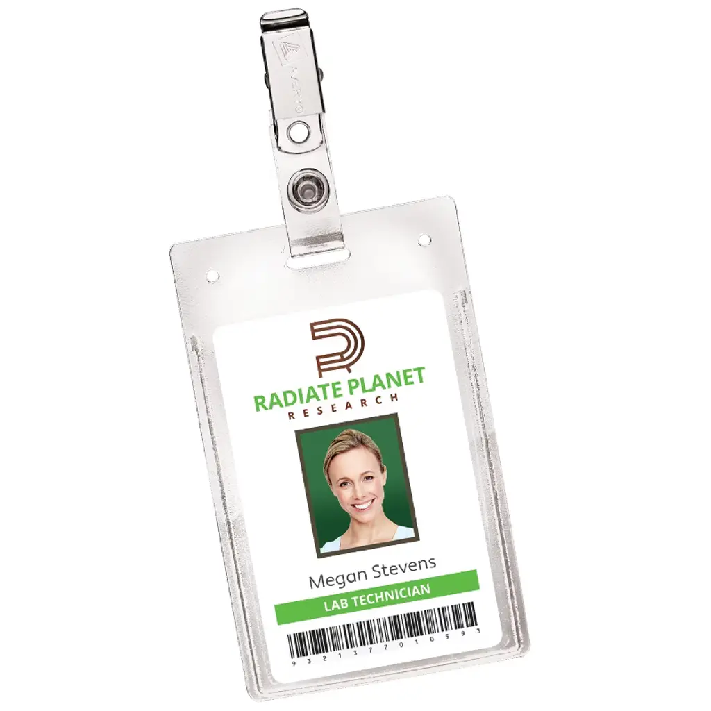 Have your name tags, staff ID cards, access control cards, or visitor passes visible and accessible with this pack of 50 Avery 2920 heavy-duty name badge holders with clips. Ideal for permanent or temporary identification, these vertical 3.5” x 2.25” reusable name badges are made from PVC heavyweight plastic durable enough for everyday use. The convenient Secure Top design ensures cards, name badges, or other inserts stay secure, while the garment-friendly clip attaches to clothing without damaging fabric. These badge card holders are also compatible with Avery Badge Inserts 5390 (inserts sold separately), making them great for custom name tags for meetings and events, volunteer badges, name tags for kids, and more. Use these versatile and durable badge holders at the office, jobsite or corporate event, for the classroom or school field trip, at conventions or trade shows, or even at your next reunion, party or big family get-together.