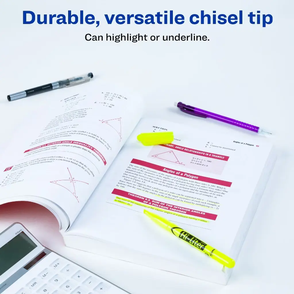 Bring attention to essential words and phrases with Avery Hi-Liter Pen-Style Highlighters. The molded chisel tip of these highlighters gives you the precision to highlight or underline text in an eye-catching fluorescent yellow ink. Keep your documents in pristine condition with a smear-safe highlighter ink that doesn't bleed through most paper and won't smudge pen, marker or inkjet inks. Pen-style highlighters are comfortable to handle and feature a narrow barrel and a removable cap. Its tip won't fray or mush, and the handy clip lets you carry it with ease. The improved ink formula ensures that highlighters can be left uncapped for up to one week without drying out. Don't worry about getting highlighter ink onto your hands; the water-based ink is easy to wash from skin and is ACMI-certified nontoxic, making these Avery highlighters safe for kids and classroom use.