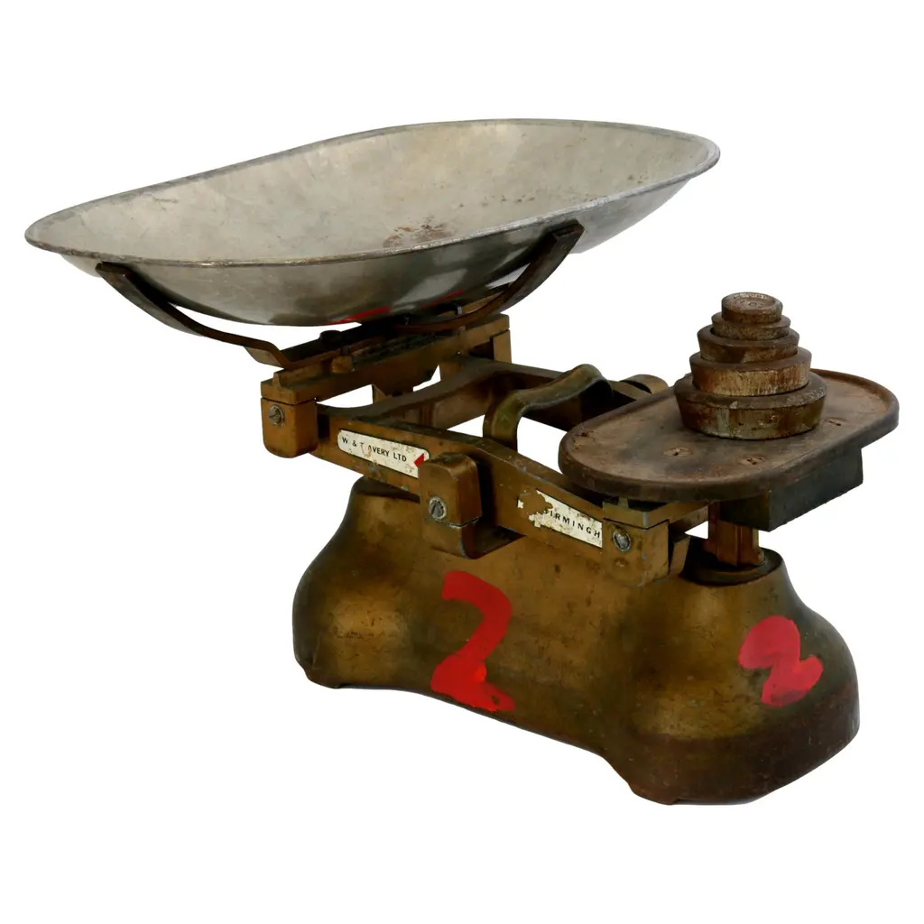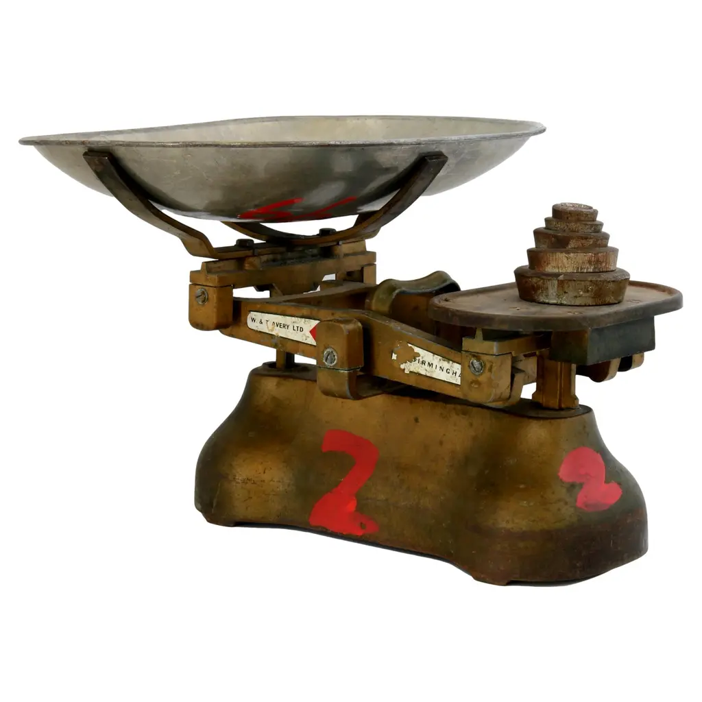 Vintage Avery industrial scale with weights and original bowl. Exactly as found, with painted numbers on body of scale. Dimensions: scale and tray, 16.5"L x 15.25"W x 11"H; 1lb weight, 3"Dia x .5"H; 8oz weight, 2.25"Dia x .5"H; 4oz weight, 1.75"Dia x .25"H; 2oz weight, 1.5"Dia x .25"H; 1oz weight, 1"Dia x .25"H.