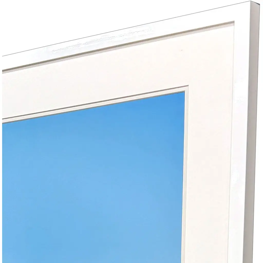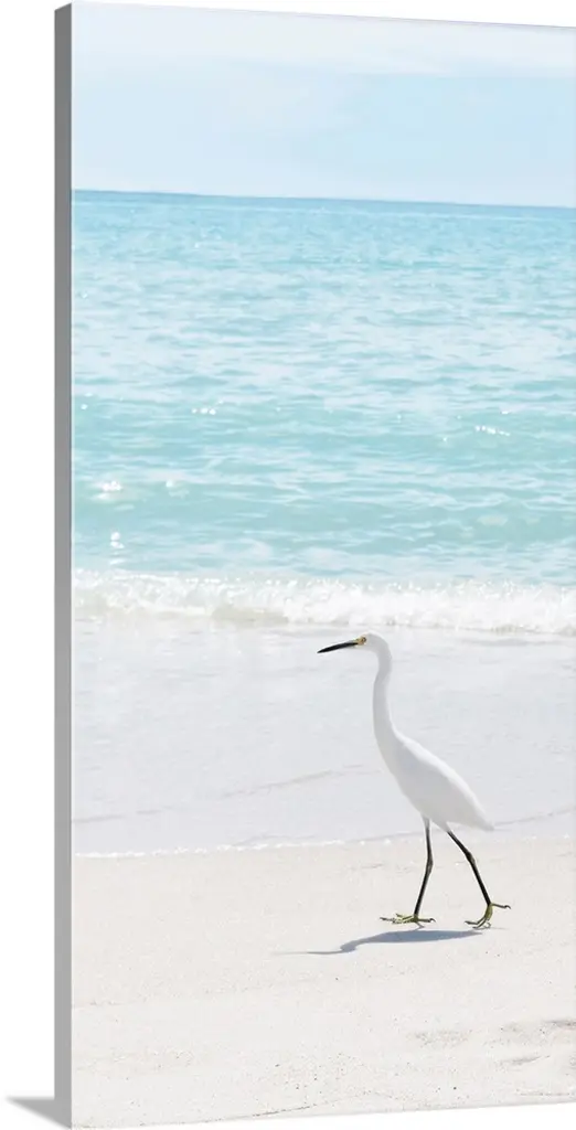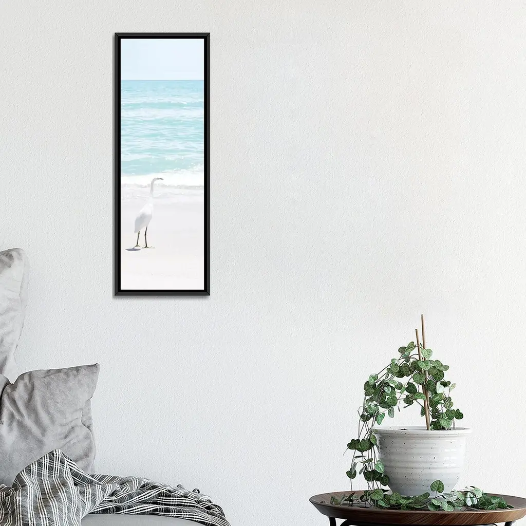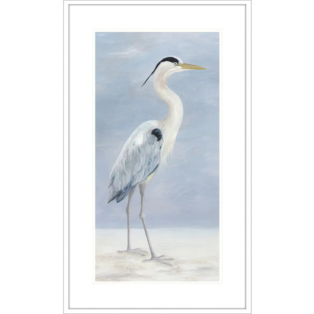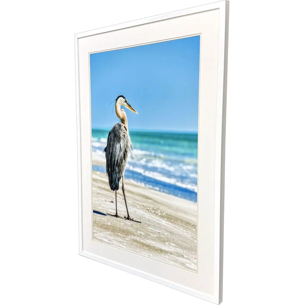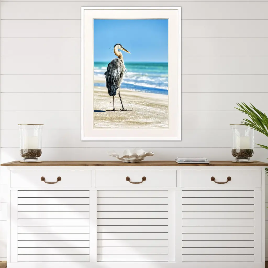 A beach bird stands watch at the shoreline. Double matted in white and light buff. Framed in a lacquered white wood shadow box style moulding.