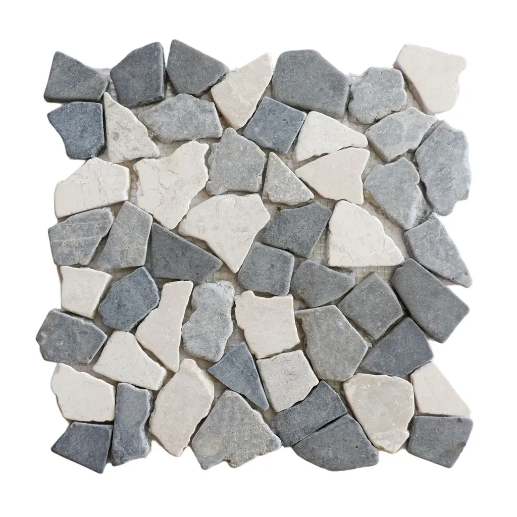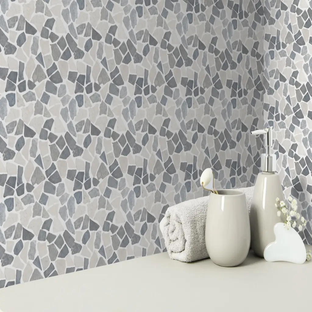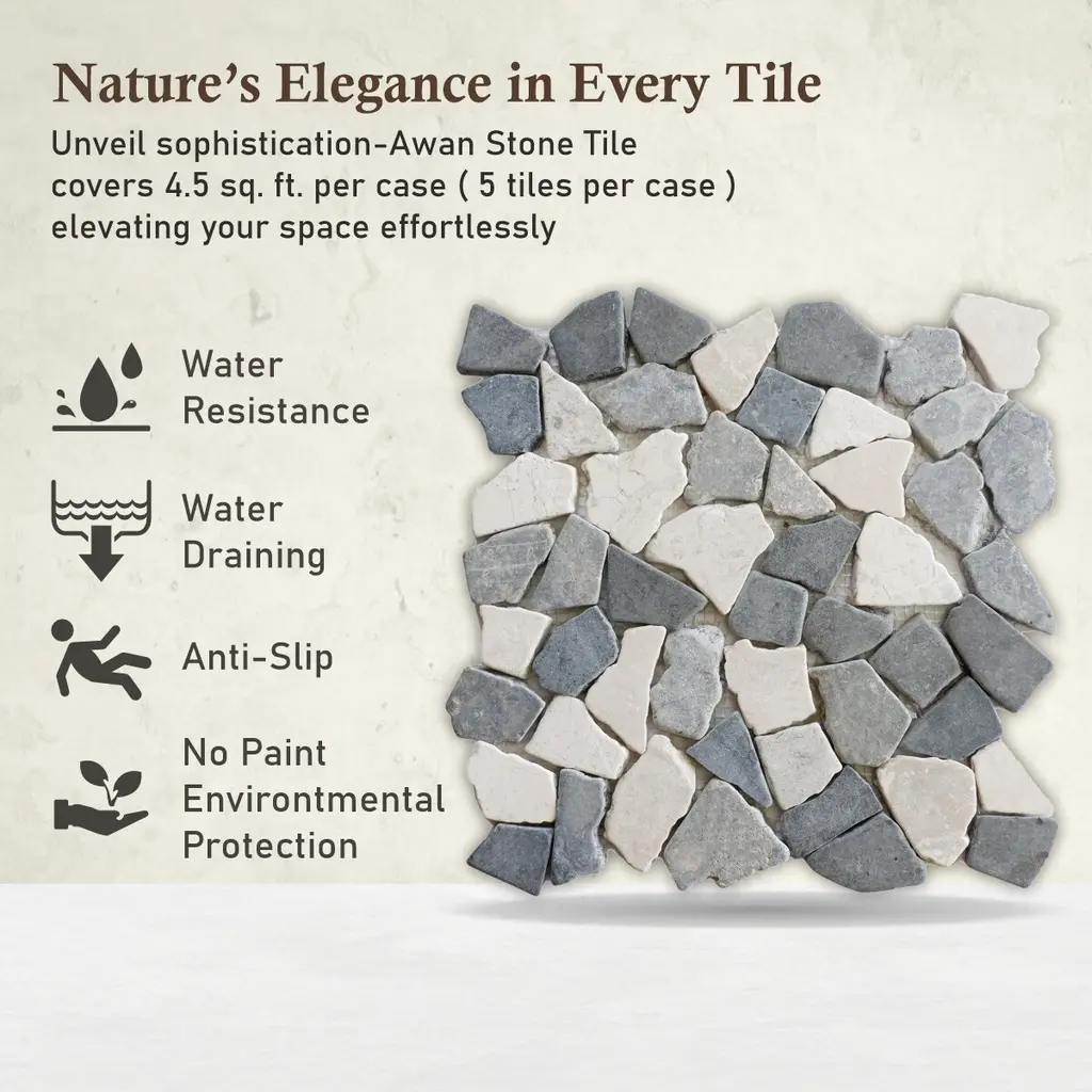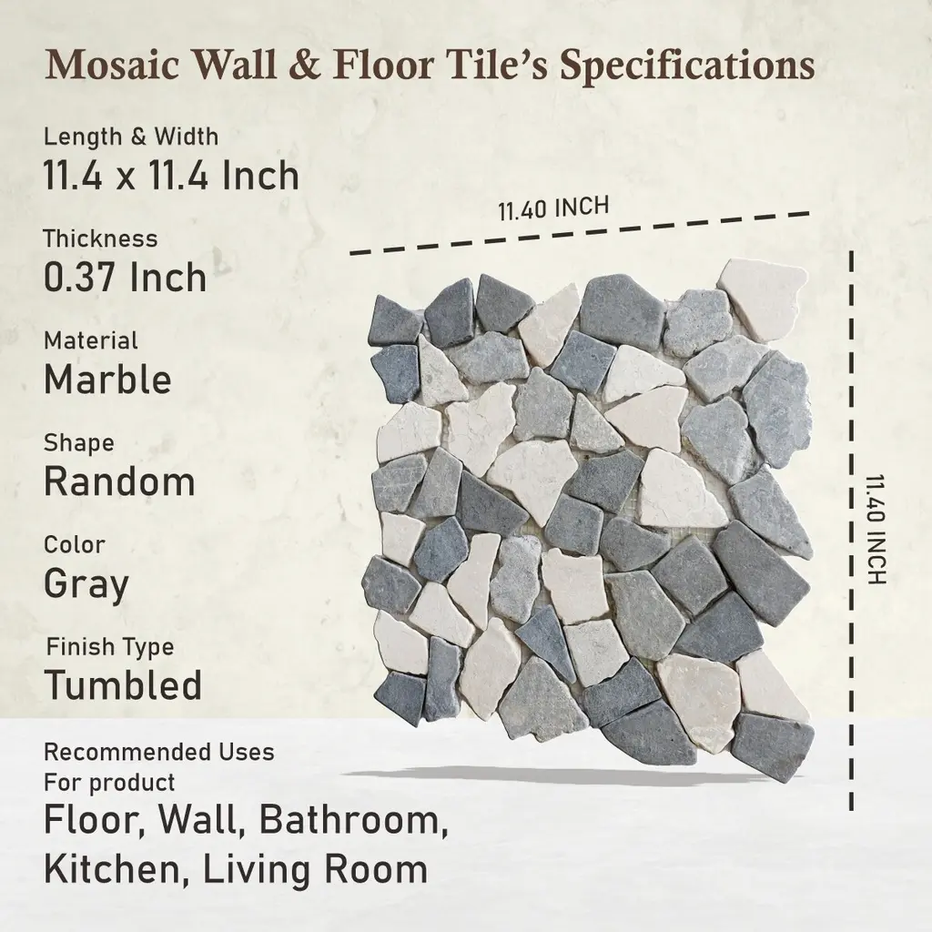 PALLADIANA mosaic creates a seamless floor with interlocking marble pieces reminiscent of ancient Italian floors. Artisans in The Venato developed the art of placing interlocking pieces of marble infilled with cement and hand grinding the stone until the floor was level around the 16th century. Marble mosaic tile made from irregular stones with touchable texture. With its au naturel look, it's perfect to use on shower floors, decks, or pools.[ Covers 4.5 sq. ft. | 5 tiles per case ]CLASSIC AND ELEGANT DESIGN : Enhance the overall aesthetic of your space with b.o.i. With our random mosaic tiles, You can get a sophisticated touch in your homes, from floors and walls to backsplashes and outdoor areas. The Pale is the perfect color palette for places where you desire a clean and calming atmosphere.VERSATILE EXCELLENCE ACROSS SPACES: Ascending to prominence, these tiles emerge as the preferred choice across diverse environments. From shower floors, where their water-resistant qualities provide functional allure, to decking areas offering durability and visual allure, and extending seamlessly to pool boundaries, they epitomize adaptability in design.SEAMLESS INTERLOCKING: The flat and polished finish of the pebble mosaic tiles makes them blend seamlessly into your design. b.o.i.tiles also create a smooth and continuous surface, enhancing the overall aesthetic of your space. Their consistent 11.4"" x 11.4"" size makes them easy to install, allowing you to achieve a polished and professional look effortlessly.ANTI-SLIP SURFACE: Perfect for shower floors and poolside edges, these tiles prioritize safety with their anti-slip surface. Enjoy the beauty of pebbles underfoot without compromising on security, making them an excellent choice for wet and high-traffic areas.ELEGANT BOUNDARIES AROUND POOLS: Redefine the aesthetic of pool areas with the mosaic's inherent elegance. Whether used to delineate POOL BOUNDARIES or enhance the surrounding landscape, their water-resistant properties and captivating design contribute to an inviting and cohesive atmosphere for leisure and relaxation.LONG LASTING AND DURABLE: Made with durability in mind, b.o.i pebble mosaic tiles are built to withstand high-traffic areas. Our mosaic tiles ensure longevity without sacrificing style, whether in homes or commercial spaces. They are installed using a cement-based adhesive, which provides a solid and lasting bond, securing them firmly in place despite daily use.