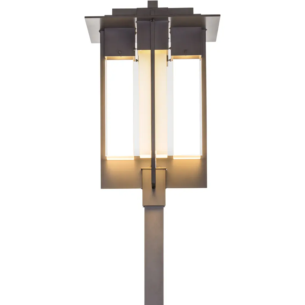 Light your way in grand style. Four handcrafted aluminum bars rise up and around to secure the glass of our large Axis Outdoor Post Light. A metal top plate and banding complete the sophisticated look.
