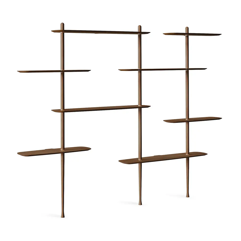 The Axis Shelving System from Nomon combines minimalist design with sculptural elegance for a customizable storage and display design. Handcrafted from solid walnut and natural walnut veneer, its modular components offer versatile configurations, allowing you to tailor the unit perfectly to your space while showcasing your favorite pictures, decor, and items from your travels. Highlights