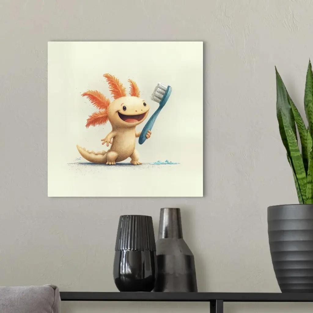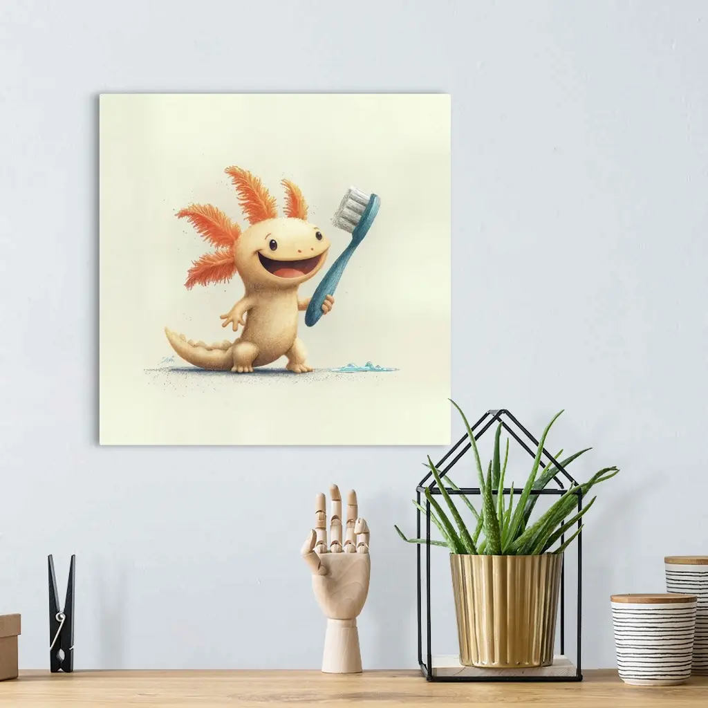 illustrated colored penicil drawing, pixar, simple, flat, fun colorful design for a theme. happy cartoon axolotl lifting his trunk and brushing his teeth, clean vector illustration, pixar style --sref https://s.mj.run/jhzdDb7ZFMM https://s.mj.run/Z4OSXZ1zx0w --v 7 Job ID: 66f384a7-9c00-4300-8930-2dff2fad6fe5