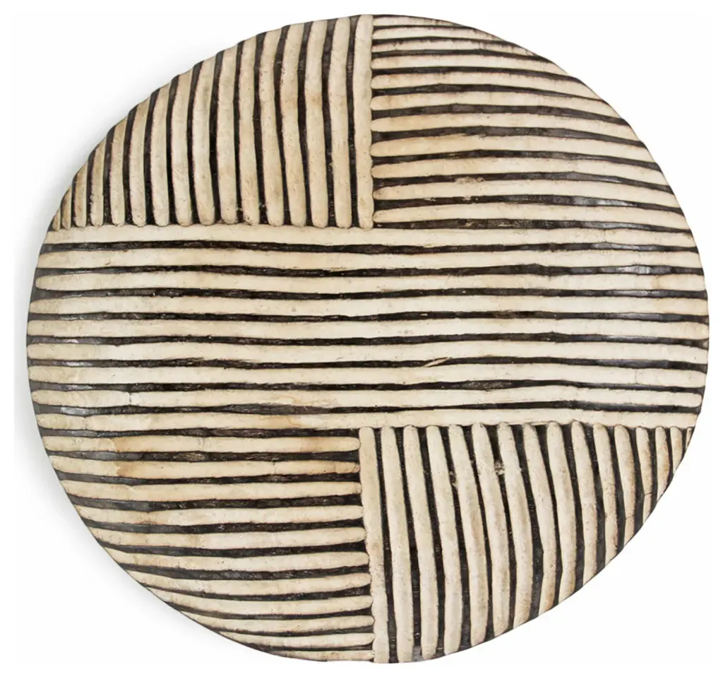 Traditional South African Zulu shields date back to King Shaka Zulu and have been used by tribesman in battle for hundred of years. As the modern world has evolved so to has the Zulu tribesman. These shields are no longer used in battle but instead used for traditional Zulu ceremonies such as weddings in telling historic ancestry stories. These carved wood designs painted in bold black and white patterns continue to have a striking modern form displayed in groupings. Each may vary slightly due to unique hand carvings. Comes with hook attached on back for hanging on wall. Antique white finish.