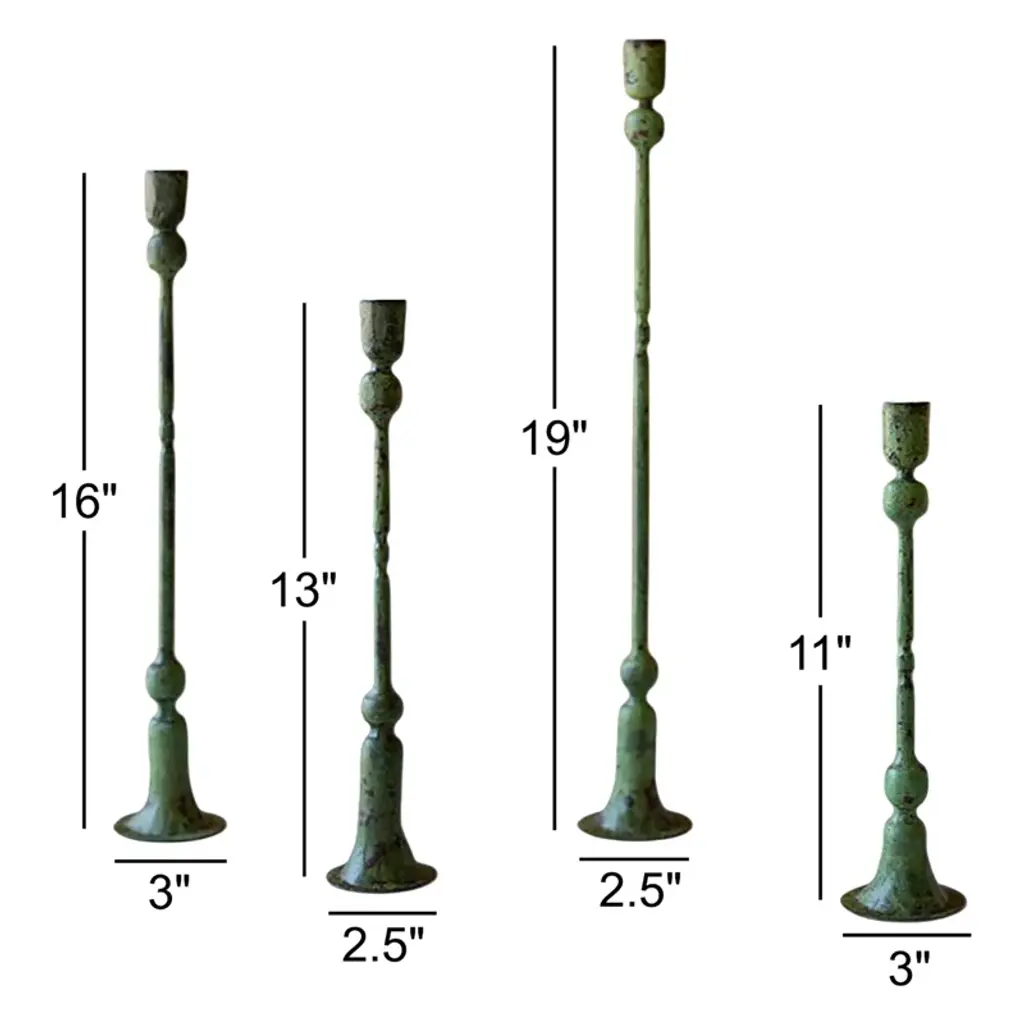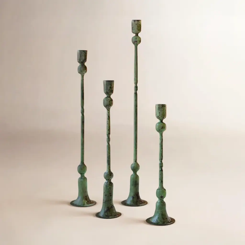 Use this set of four taper candle sticks with a green patina all over the house. Line them up on a buffet or stagger them around your haunted mansion. The set, made in India, contains four different sizes.