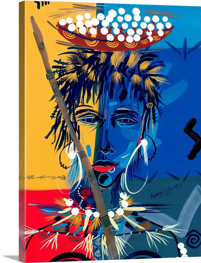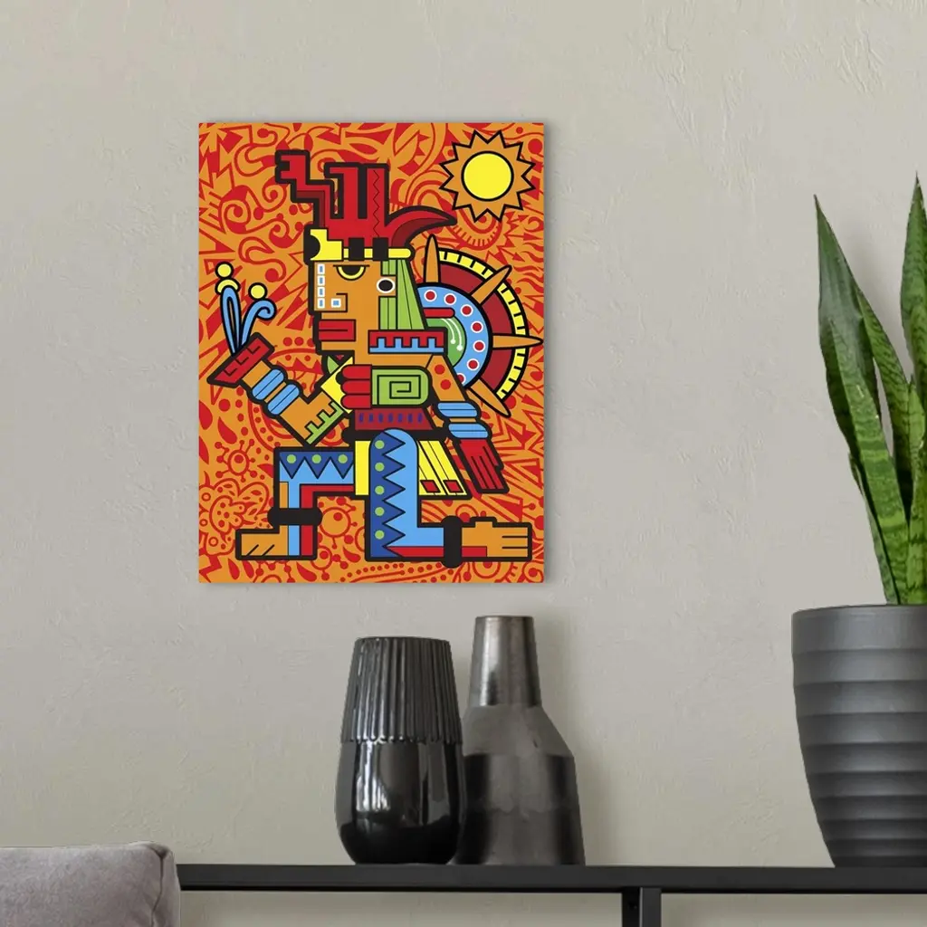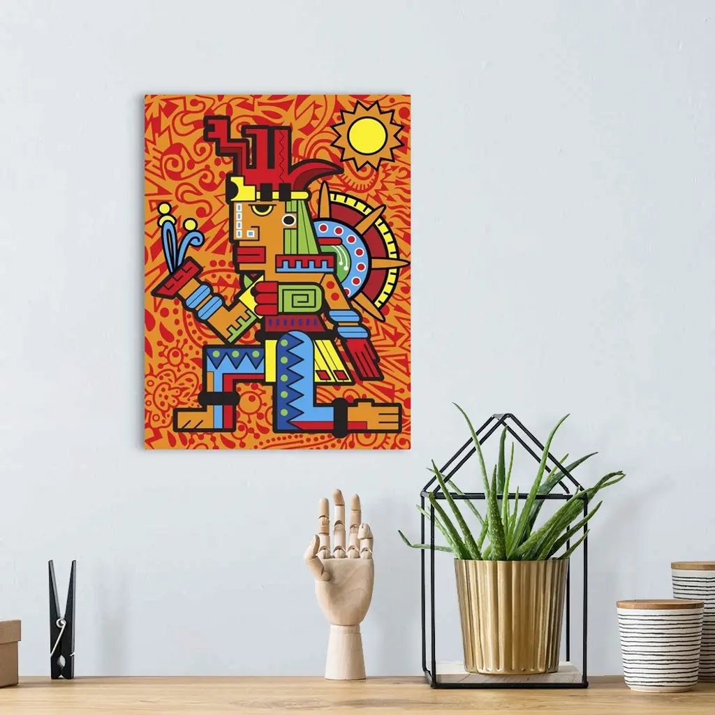 Colorful urban art inspired Aztec design of a figure in elaborate patterns and colors. Against an intricately decorated background.