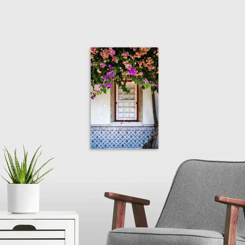 Window in old town Lisbon with azulejos and blossoming tree, Portugal.