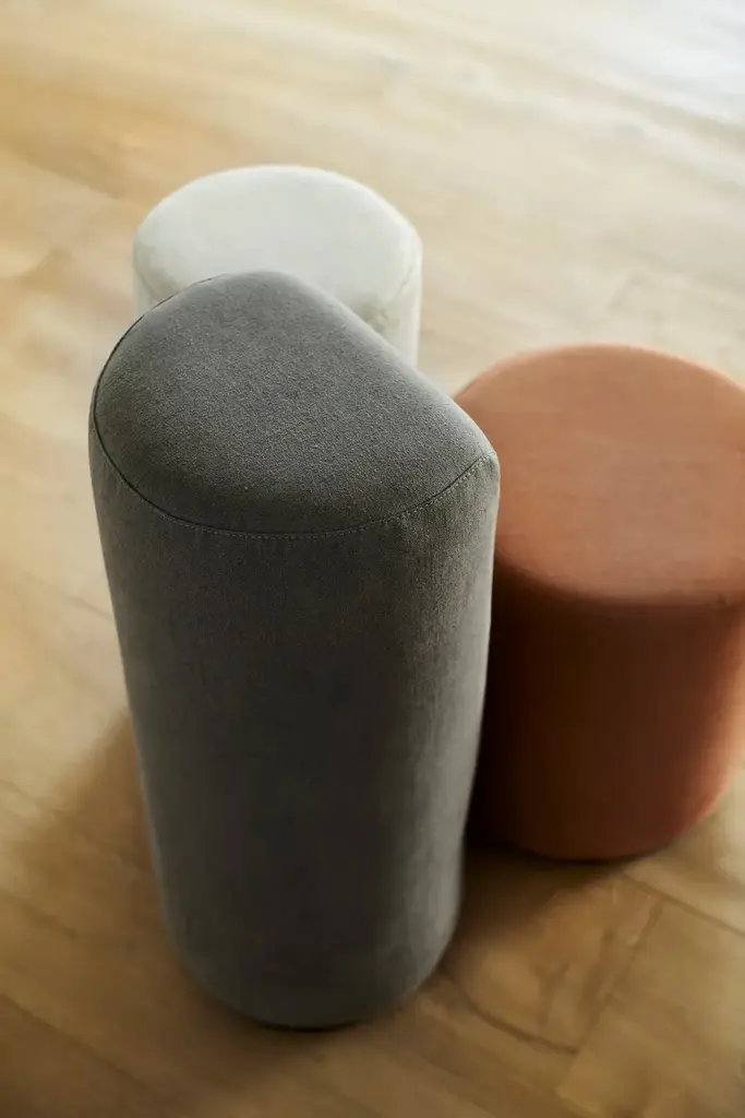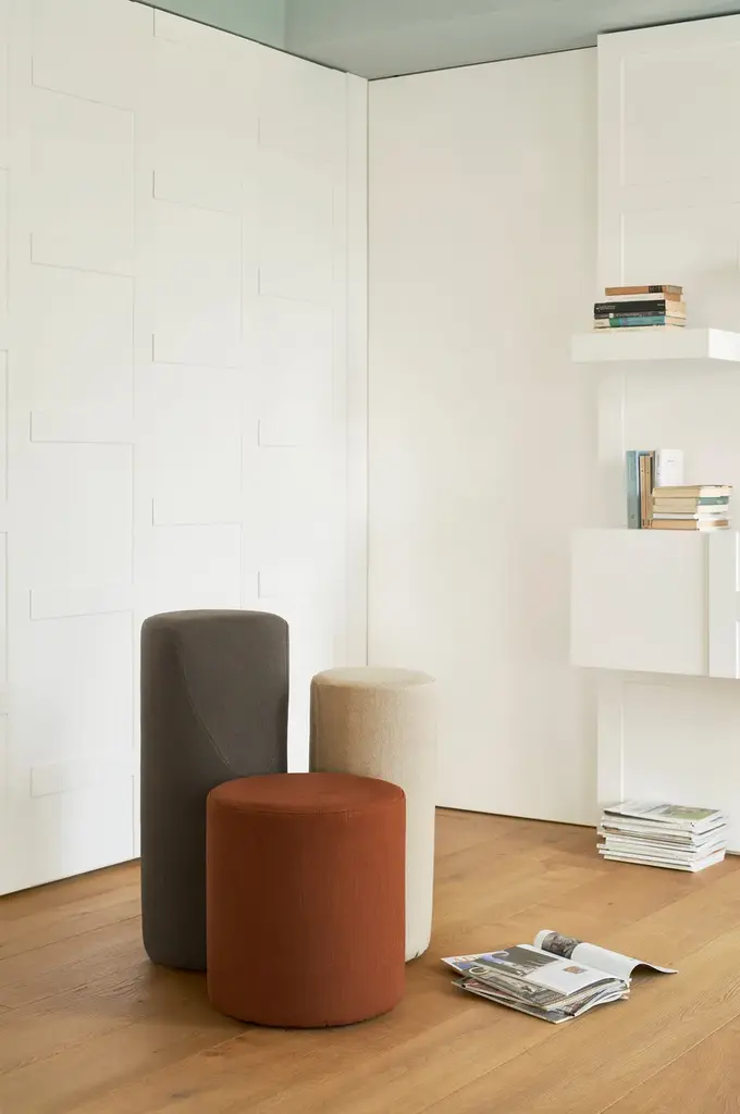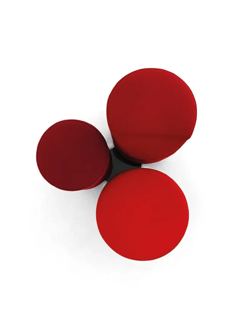 For leisure, study and work. An unusual, destructured armchair composed of two or three cylinders of different heights, connected by a steel base.B.tri and B.duo – designed by Bruno Rainaldi – are unconventional seats to accommodate one single person, but also an invitation to conviviality: the cylinders become a welcoming place any time you need to have someone close, to share something with. Original and versatile, coated either in fabric or leather, B.tri and B.duo add a touch of novelty to any environment: at home, in a state-of-the-art office space, a hotel room, or the most cutting-edge training centre.
