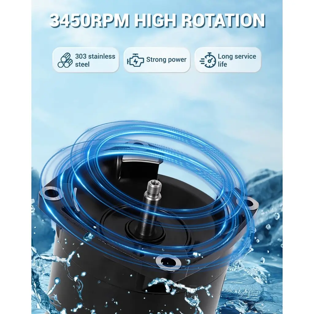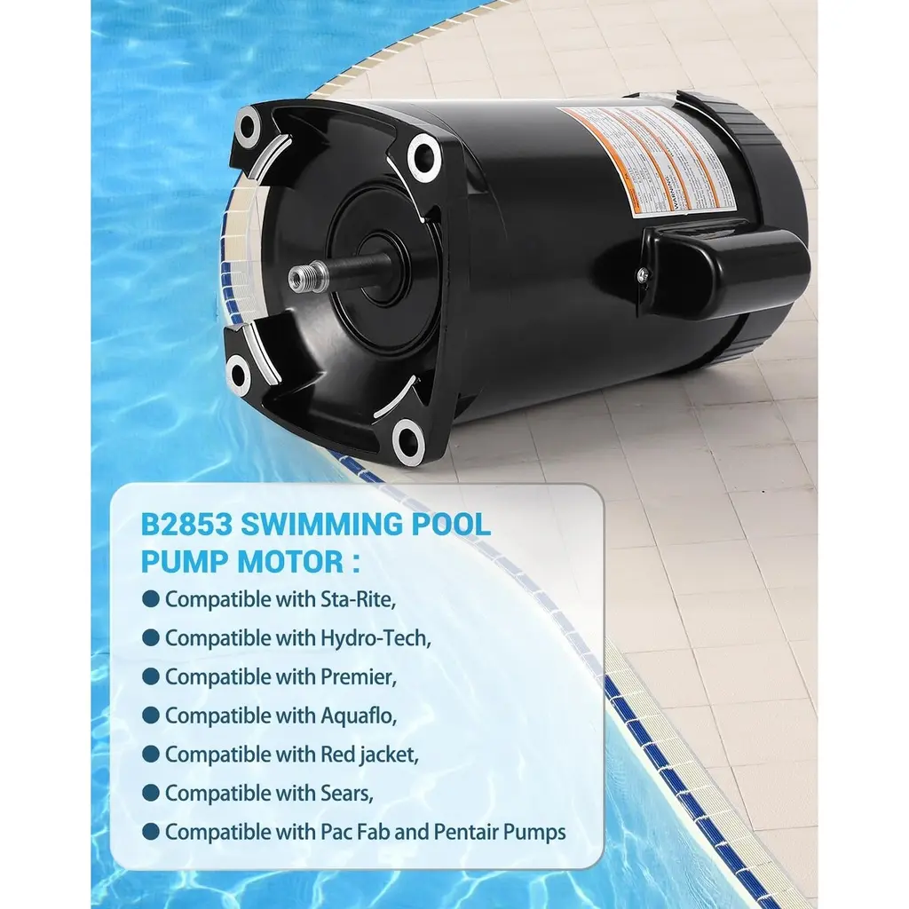 Exact Compatibility: The B2854 pool pump motor is compatible with a variety of brands including Sta-Rite, Hydro-Tech, Premier, Aquaflo, Red Jacket, Sears, and Pac Fab pumps, ensuring a seamless fit for your equipment. Industrial-Grade Power: Featuring a powerful 1HP high-torque motor, this pump supports dual voltage operation at 115V/230V with a maximum current of 6.5/13.0A. It runs at 3450 RPM, making it suitable for both residential and commercial applications. Durable Construction: Built with premium materials such as copper coils, a stainless steel threaded shaft, and a corrosion-resistant housing, this 1 HP pool pump motor is engineered to withstand tough poolside conditions and provide long-lasting performance. Strong & Efficient Performance: The B2853 motor delivers reliable power with its 1 HP output operating at 3450 RPM, efficiently circulating water to keep your pool clean and clear. It works by converting electrical energy into a magnetic field, which drives the rotor to power the pump impeller. Simple Installation: Designed for convenience, the B2853 motor includes an easy-access wiring switch on the cover, allowing for quick and straightforward installation. Replace your old pool pump motor effortlessly and have your pool running smoothly in no time.
