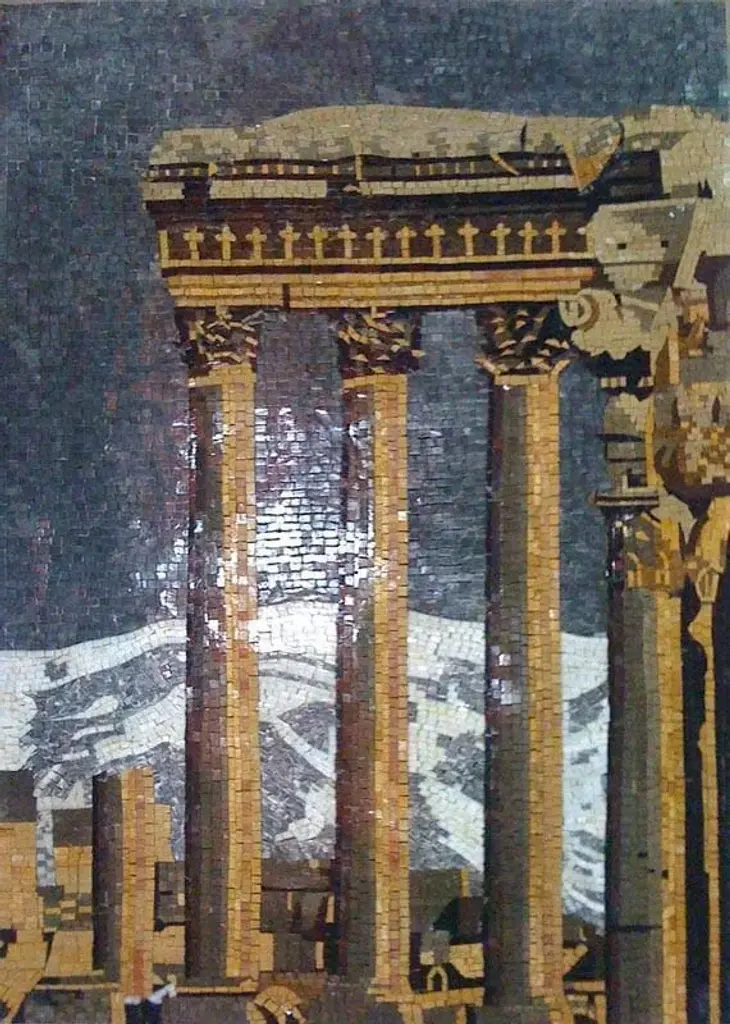 Discover the timeless beauty of ancient architecture with the BAALBEK Mosaic Scene, an exquisite representation of Lebanon's greatest Roman treasure. Celebrated as one of the wonders of the ancient world, the magnificent temples of Baalbek stand as a testament to the grandeur and sophistication of Roman engineering. This unique mosaic captures a segment of this extraordinary monument, allowing you to bring a piece of history into your own space.Handcrafted from natural stones, each mosaic is a labor of love, showcasing the intricate artistry that goes into creating such a stunning work of art. The natural stones not only add elegance but also ensure durability, making this piece suitable for both indoor and outdoor installation. Imagine adorning your garden, patio, or living room with this stunning homage to Roman heritage; it effortlessly elevates the ambiance of any setting.Whether you're an art enthusiast, a history buff, or someone who simply appreciates the finer things in life, the BAALBEK Mosaic Scene will captivate your imagination and enhance your decor. Each piece tells a story, inviting you to envision the rich cultural tapestry of Baalbek and its breathtaking temples. Perfect as a statement piece or an addition to your collection, this mosaic blends seamlessly with various design styles, adding a touch of historic elegance to modern aesthetics.Indulge in the allure of ancient history and let the BAALBEK Mosaic Scene transform your space into a gallery of timeless beauty. Elevate your environment and celebrate the artistry involved in this remarkable creation. Bring home this stunning mosaic today and allow the legacy of Baalbek to inspire and enchant you for years to come.