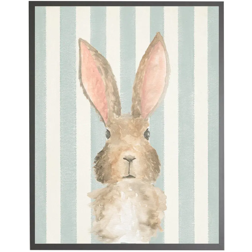 Baby Rabbit Watercolor Print Blue Stripes Grey Frame Children's Arts (Size Options)