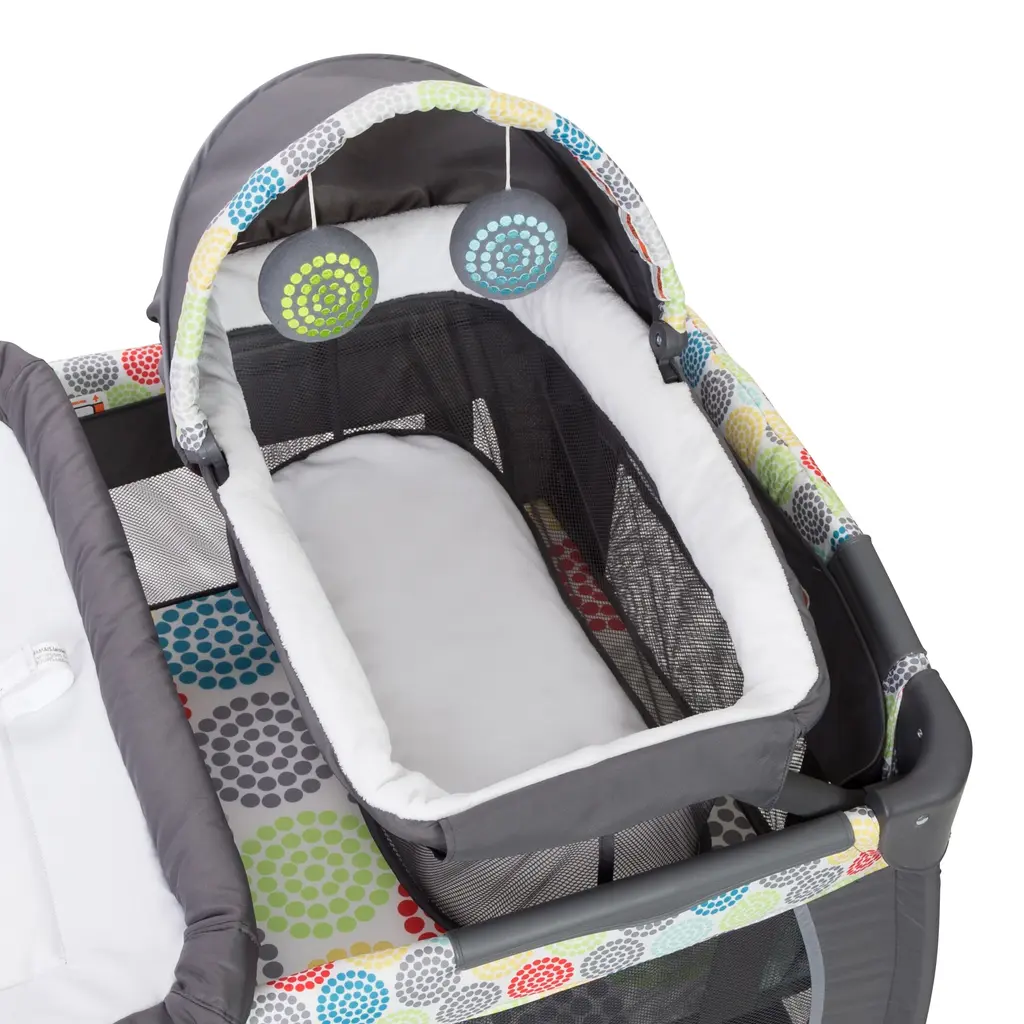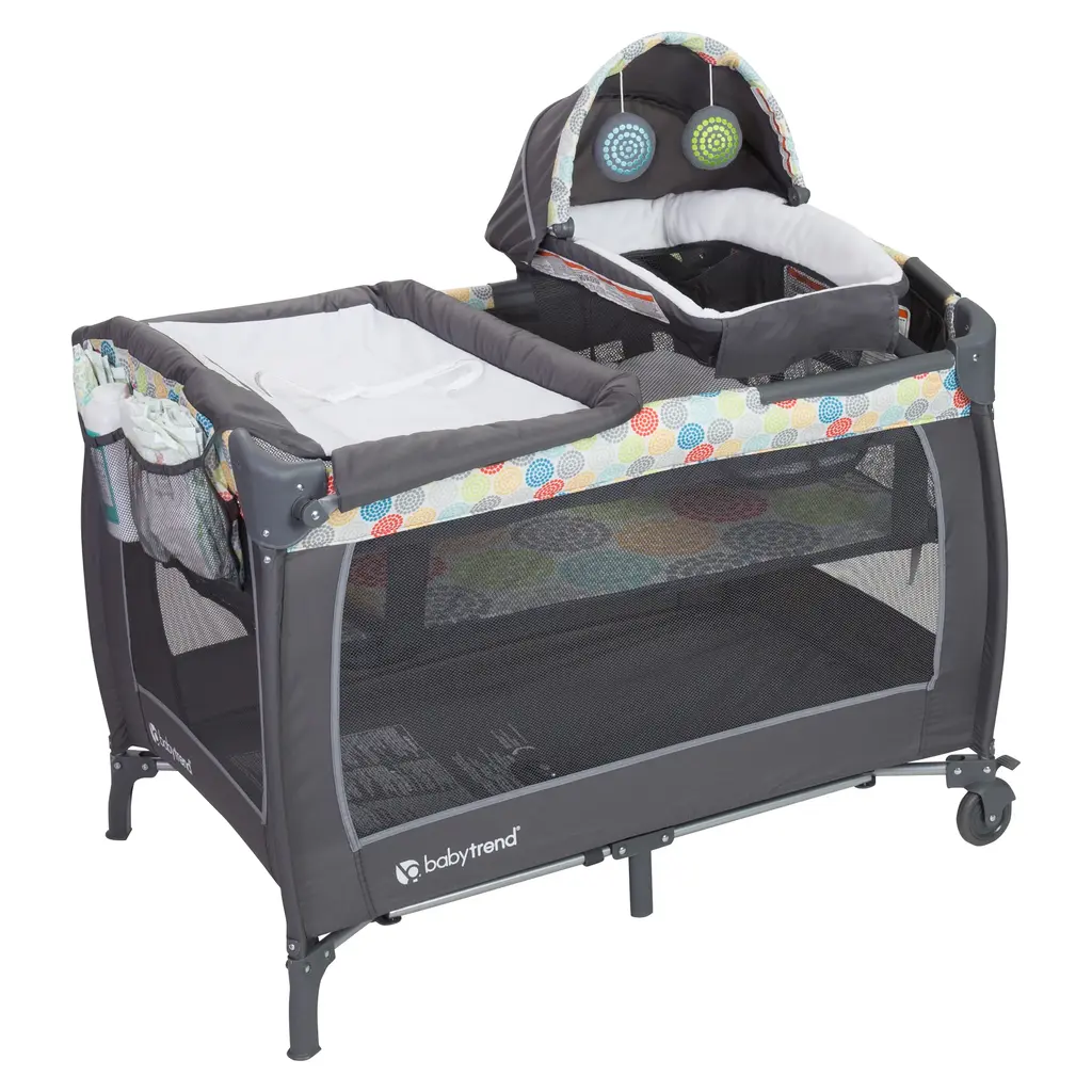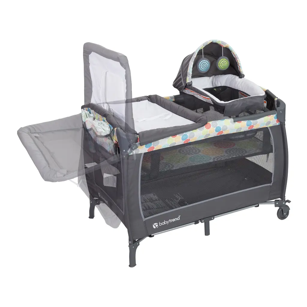 Your little one will feel comfy and secure in the adorable Lil Snooze Deluxe II Nursery Center in Funfetti from Baby Trend. The removable napper with canopy is perfect for a little shuteye throughout the day and the hanging toys keep them entertained while awake. Diaper time is a breeze with the flip away changing table and storage pocket for changing essentials. As your baby grows, the nursery center transforms into the ideal play time center and the large caster wheels with brakes provide added mobility and stability. The Nursery Center folds compact and easily fits into the included travel/storage bag for convenient portability. Features: Cozy napper with canopy and 2 plush toys, Flip away changing table, Removable full bassinet, One hand locking mechanism, Two large wheels with brakes for added security, Easy compact fold and Travel/storage tote bag. Recommended Use: Play Yard: Birth ~ 30 lbs or 35", Full-size Bassinet: Birth ~ 4 m, weight: up to 15 lbs, height: up to 25" whichever comes first. Changing Table: Birth ~ 4 m, weight: up to 15 lbs, height: up to 22" whichever comes first. Napper: Birth ~ 3 m, weight: up to 15 lbs.
