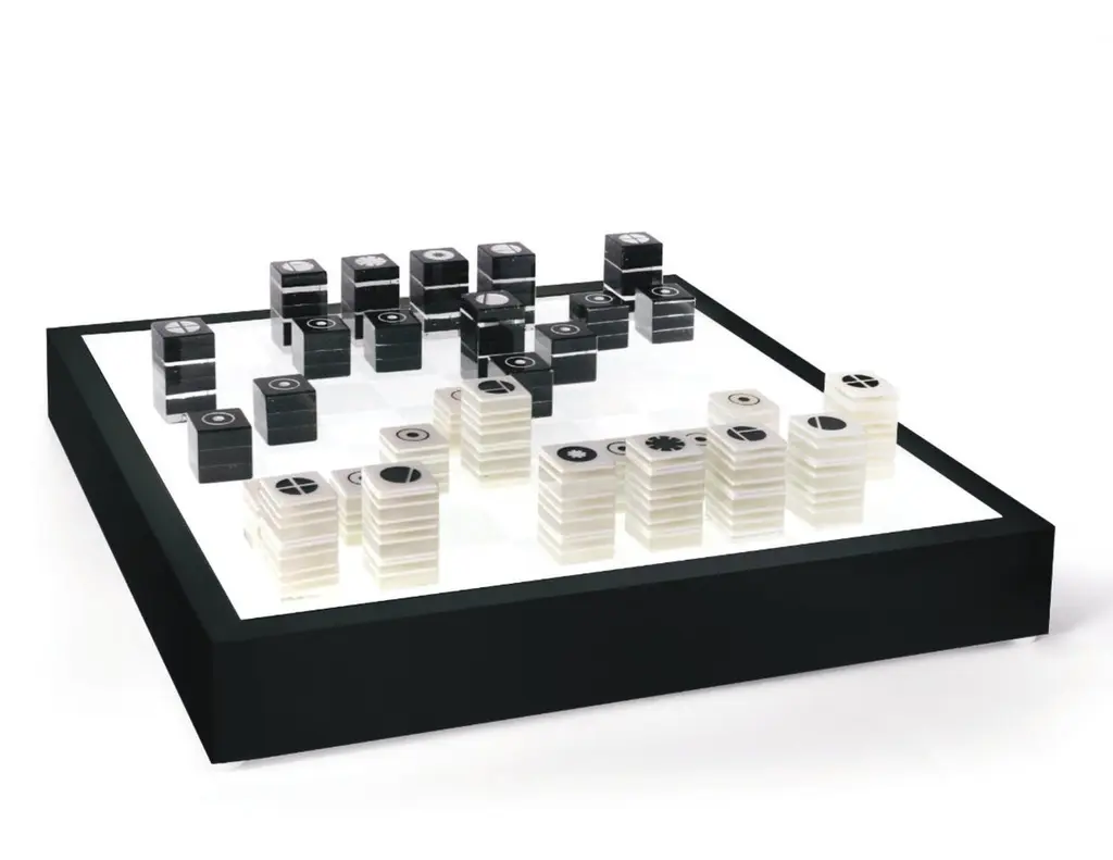 This chess belongs to the Board Games collection designed by Orfeo Quagliata.Exclusive techniques from the artist. 100% handmade with highest quality material. The chess pieces fabricated under the cast glass technique represent Orfeo's craftsmanship at his best.This elegant board game changes the mood when turned on, and given its functionality and artistic background it could be considered as an objet d'art itself. The shimmer looking black and white chess goes perfect in diverse interior spaces.