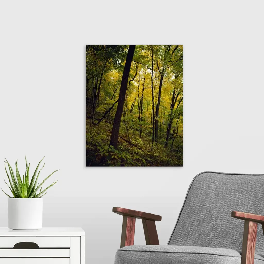 Back lit autumn color trees along Sugar Maple Trail, Wyalusing State Park, Wisconsin wall art for home and office decor. Discover canvas art prints, photos, mural, big canvas art and framed wall art in GreatBigCanvas.com's varied collections.