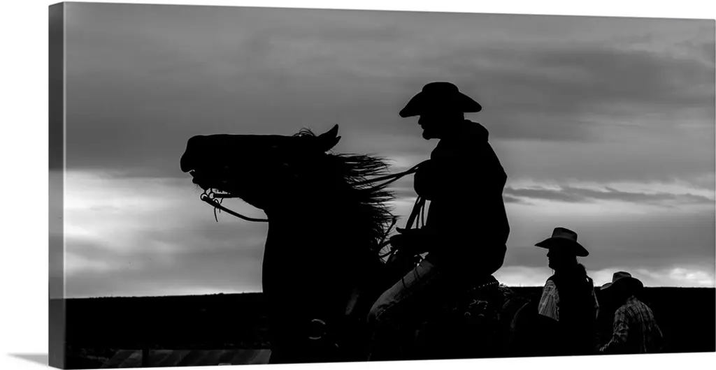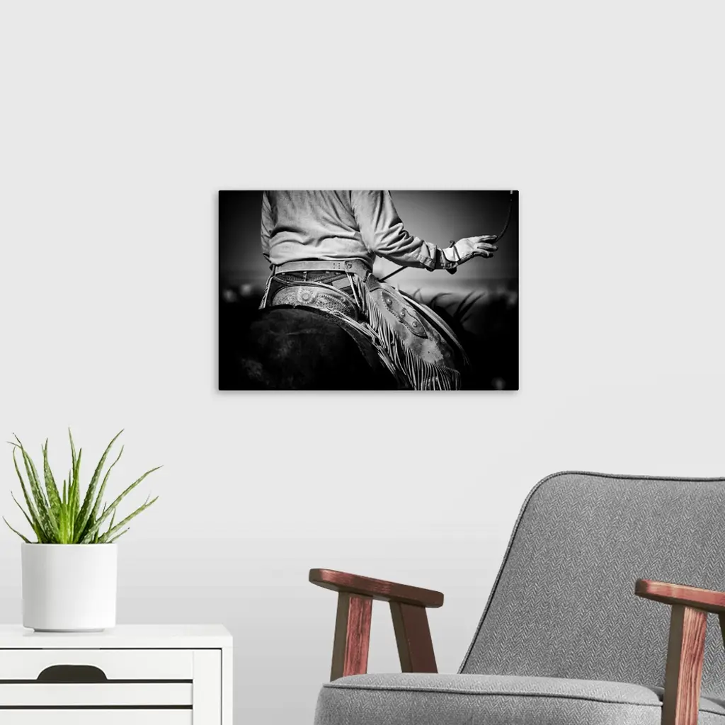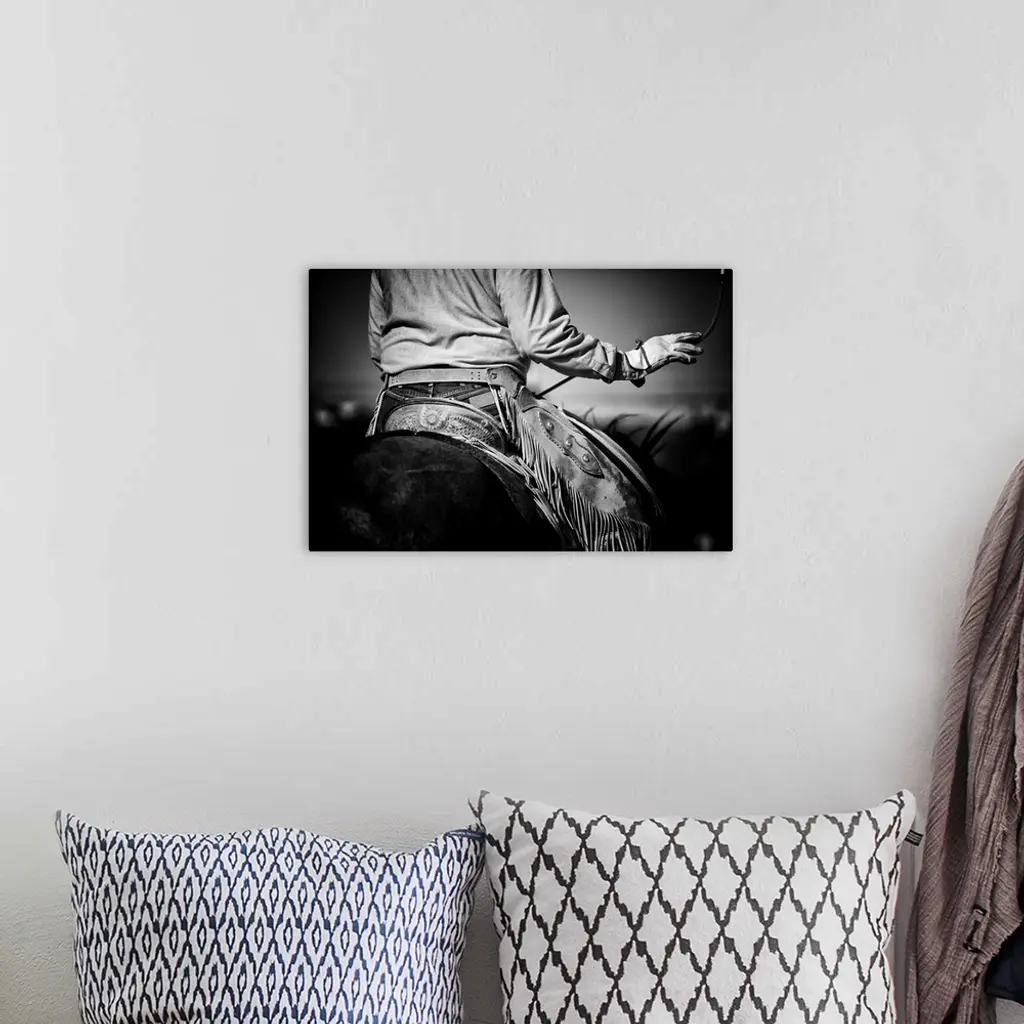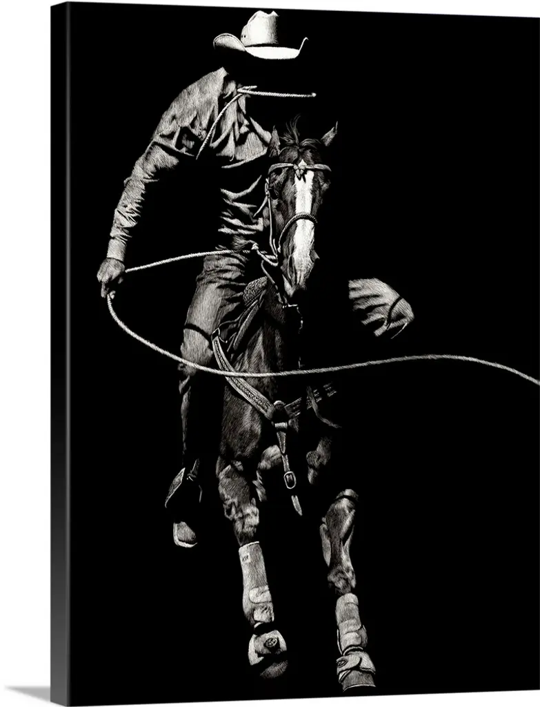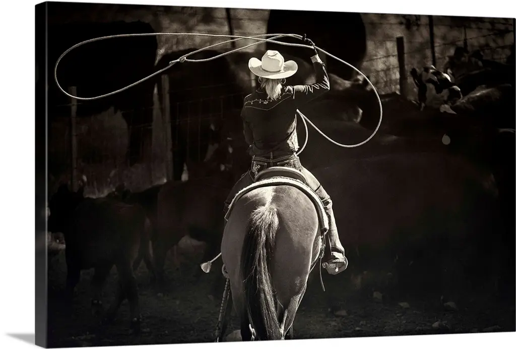Black and white photograph of the back of a cowboy on horseback swinging his lasso.