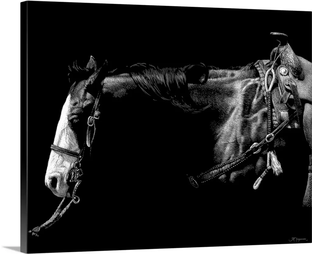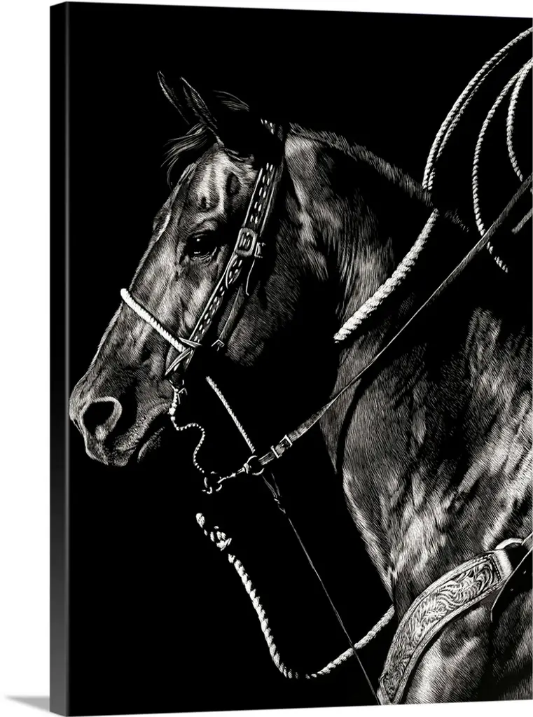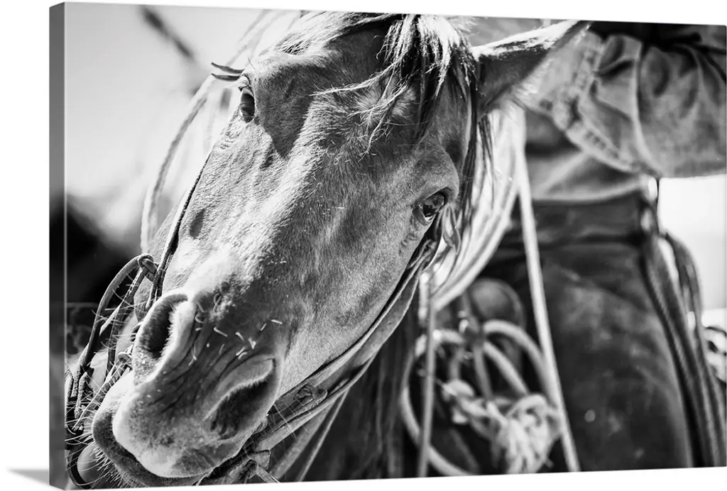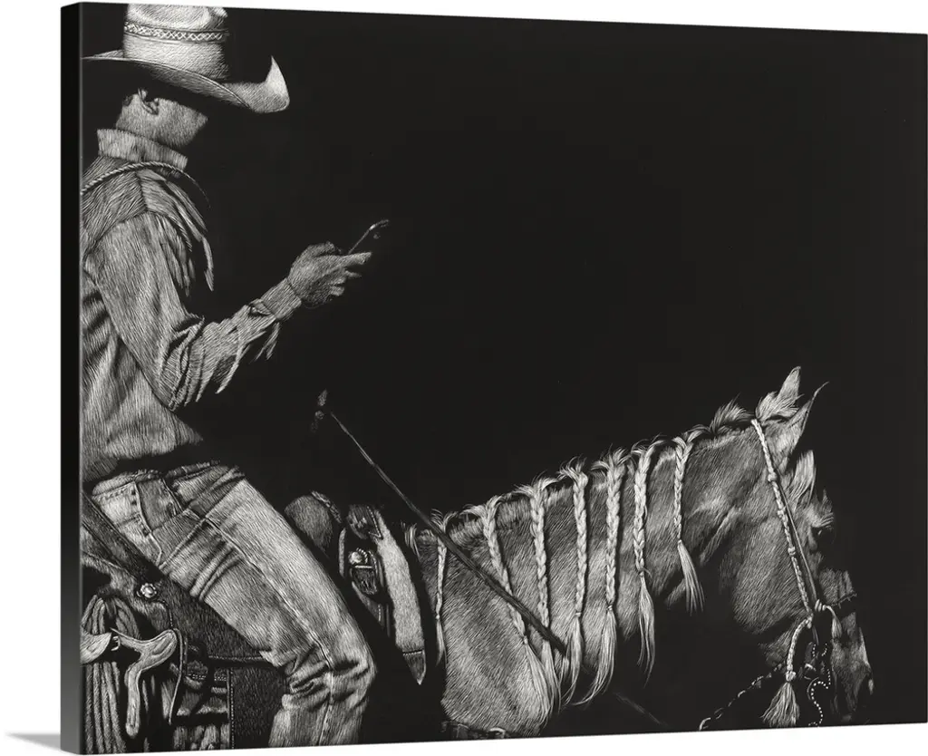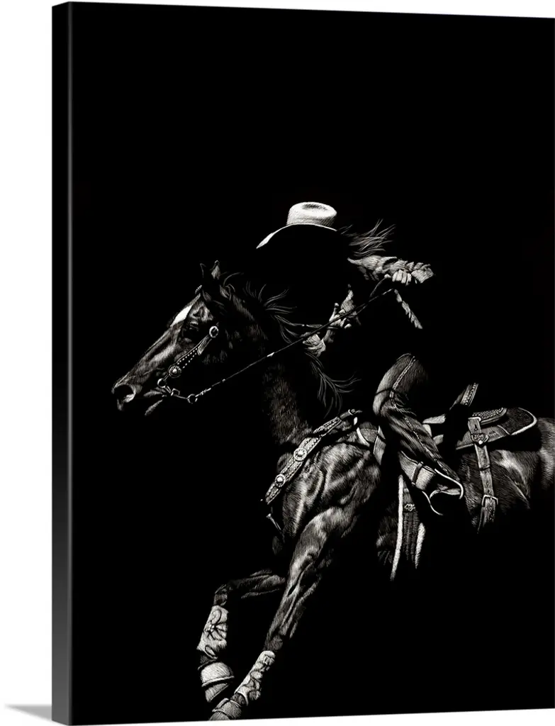 Black and white photograph of the back of a cowboy on horseback swinging his lasso.