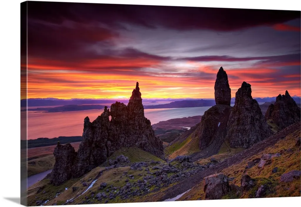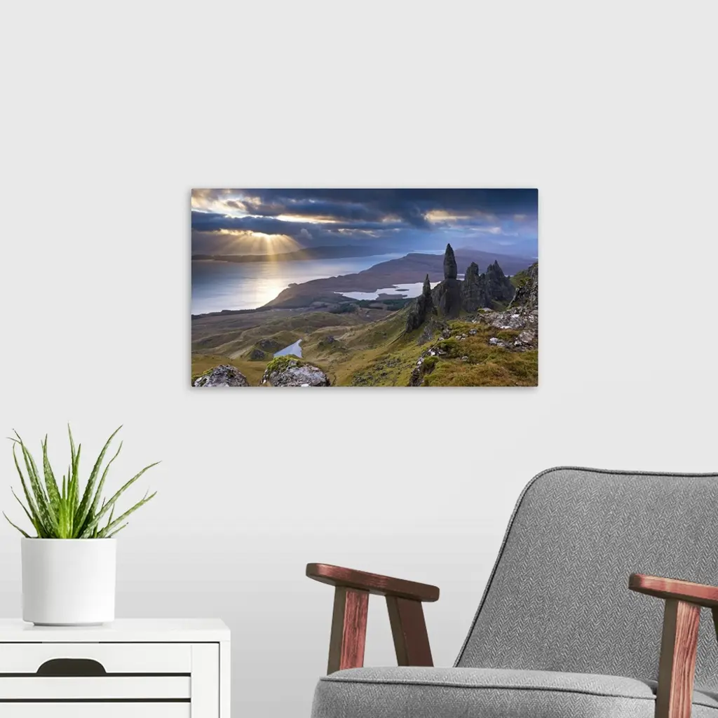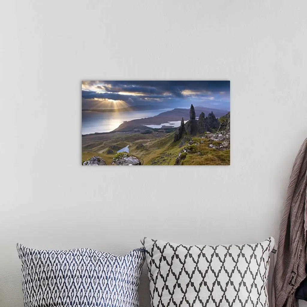 Pointed rocks on a hillside overlooking a lake with sunlight shining through the clouds.
