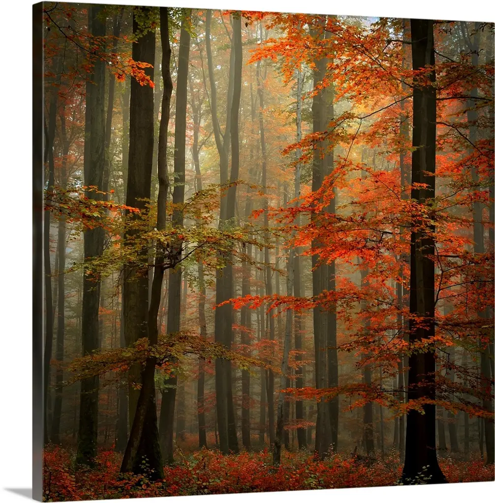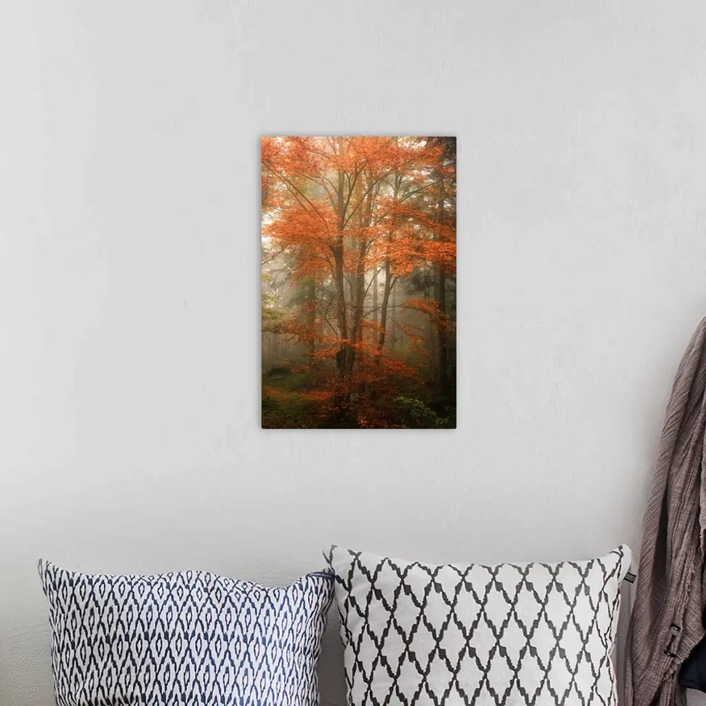 View through a misty forest with trees full of orange leaves.