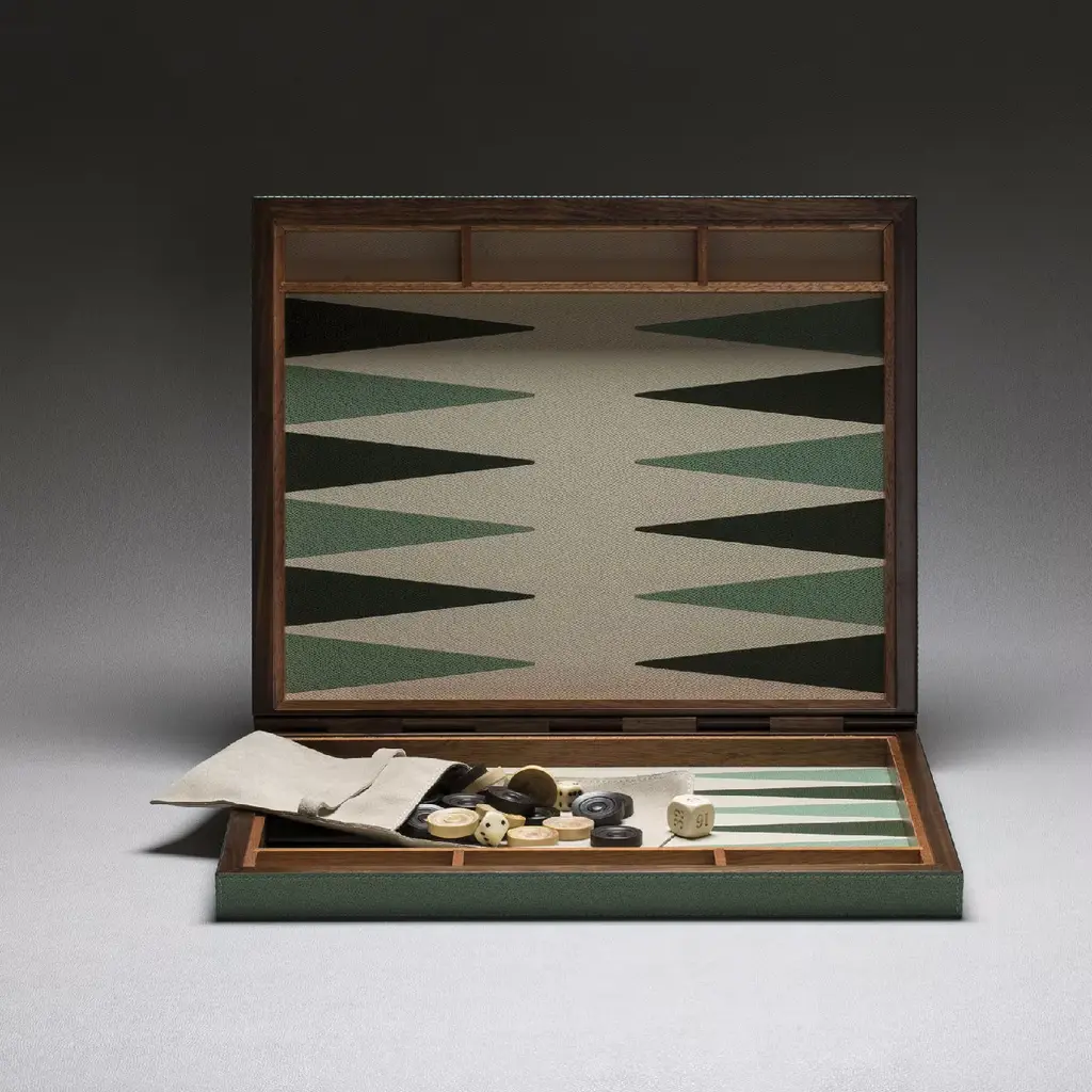 This elegant small backgammon case is made entirely in walnut wood and mahogany and uses walnut wood hinges. The playing surface is in inlaid leather and the color combination of the board can be customized. Checkers in boxwood and dice are included. A magnetic closing stores all items securely in, while the outside surface of the box is covered in elegant leather for a luxurious final effect. Different colors and types of leather are available from GioBagnara's chart.