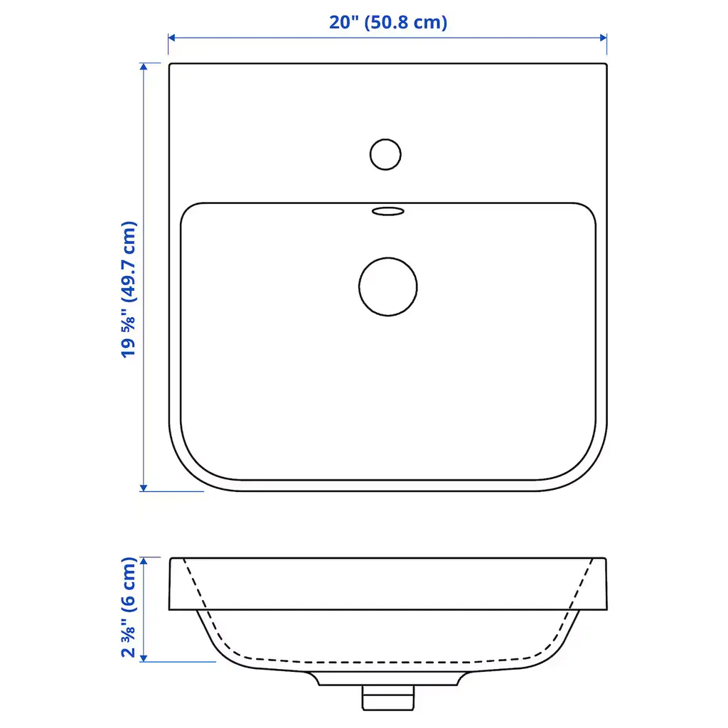 BACKSJÖN Semi-recessed sink with water trap - black 20x19 5/8 ". The rim of the wash-basin lies above the countertop (sold separately) while the rest sits below. This solution creates valuable counterspace for bathroom essentials. 10-year Warranty. Read about the terms in the warranty brochure.