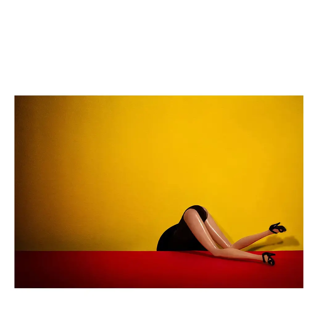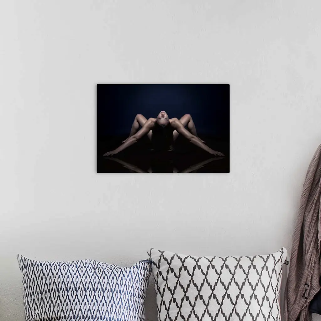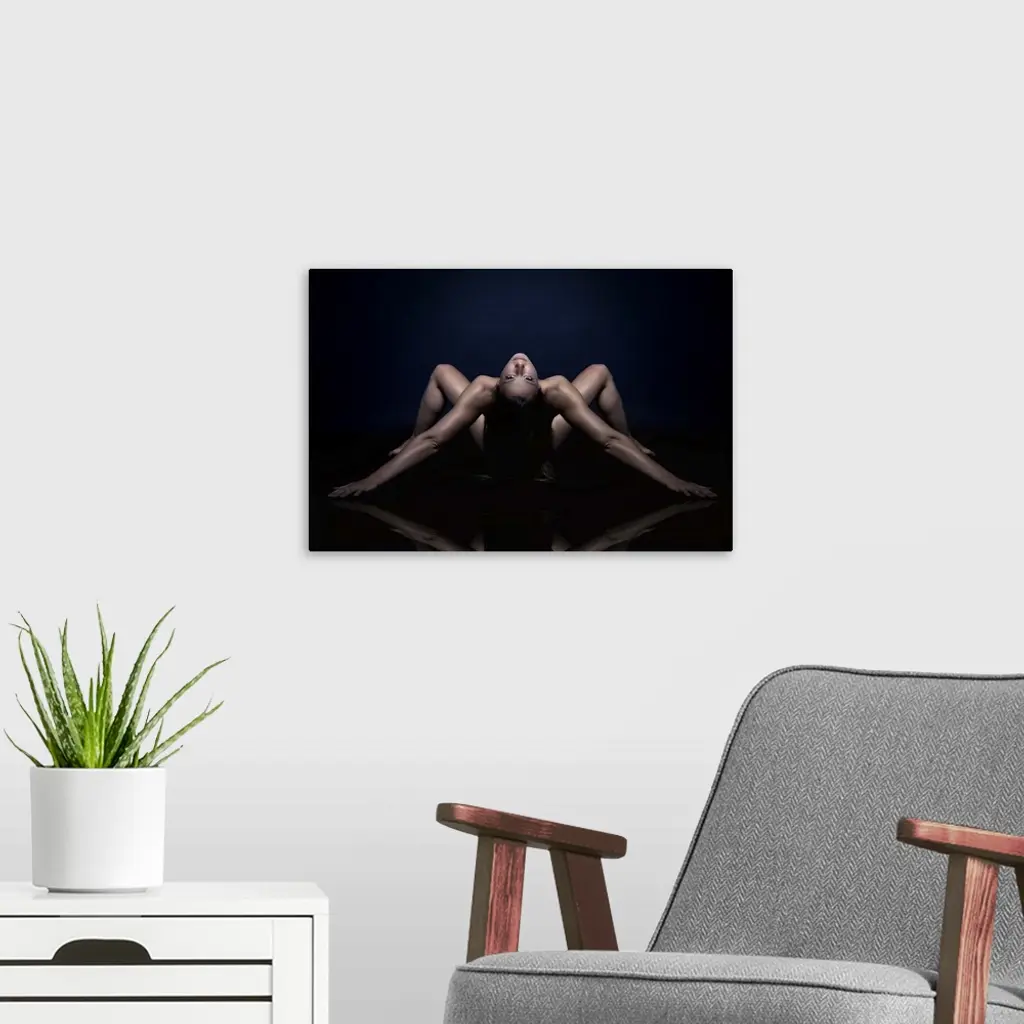 Nude portrait of a woman bending over backwards.