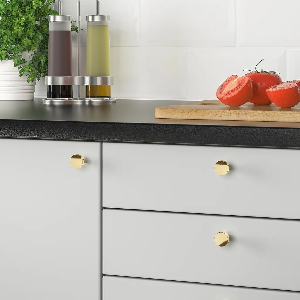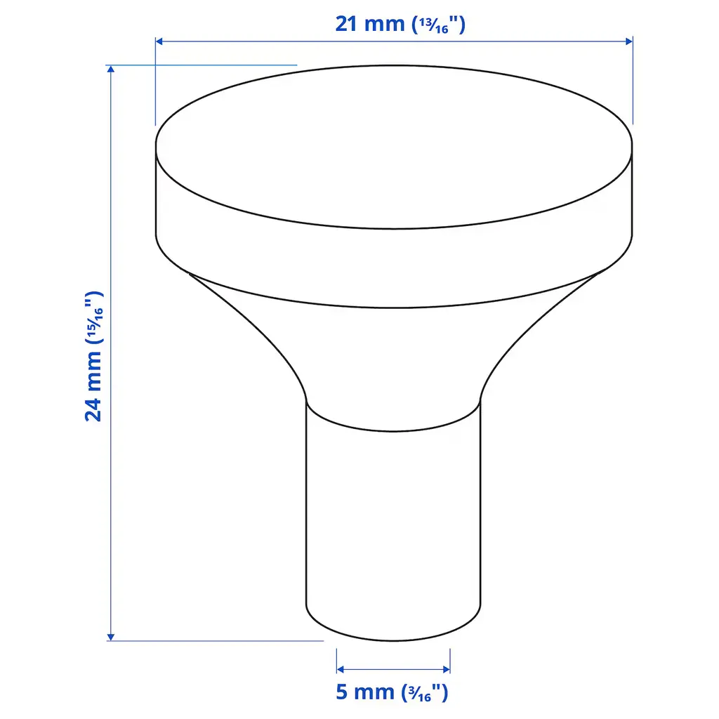 BAGGANÄS Knob - brass color 13/16 ". BAGGANÄS is a modern knob with clean lines. It comes in black, brass and stainless steel, so you can choose the one that suits your taste and home best. Suitable for doors ½"-¾" thick. Screws included.