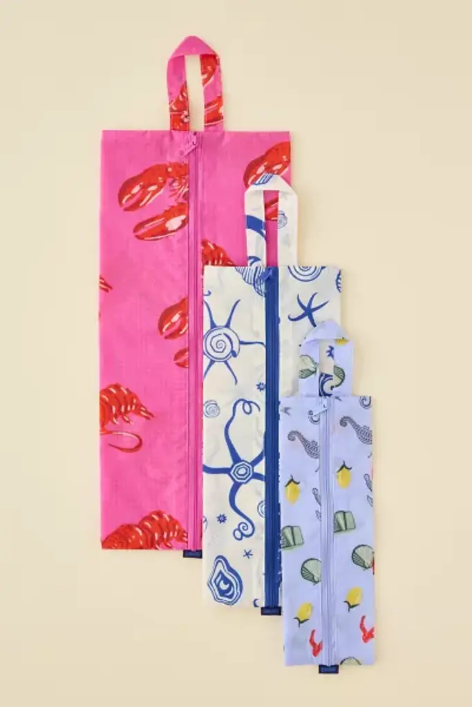 Carry your school tools, beauty essentials and everything in between with this trio set of pouches by BAGGU. Featuring a collapsible silhouette to easily fold and store in your bag, this set includes 3 pouches in Small, Medium and Large sizes with BAGGU’s iconic motifs allover. **Features** \- Pouch set by BAGGU \- Made using recycled materials \- Finished with BAGGU’s statement hues \- Includes Small, Medium & Large sizes \- Collapsible silhouette for easy storing \- Handled design \- Zip closure **Content + Care** \- Includes 3 pouches \- 100% Recycled ripstop polyester \- Machine wash \- Imported **Size** \- Small dimensions: 3.5"l x 3.5"w x 7"h \- Medium dimensions: 5"l x 5"w x 8.5"h \- Large dimensions: 7"l x 6.5"w x 10"h