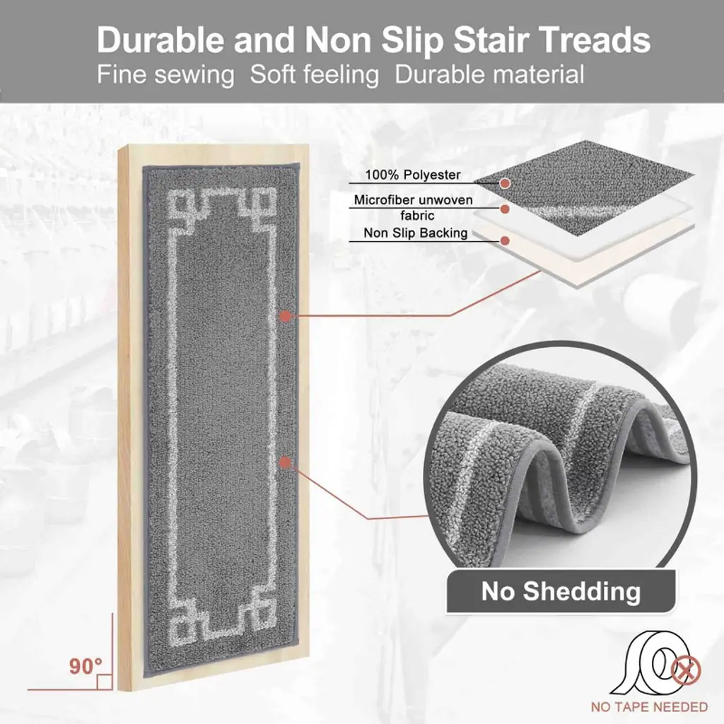 This set of stair treads offers soft polyester comfort with durable stitching and edge-locking to prevent fraying or piling¡ªperfect for creating a quieter, cozier stairway for your family.