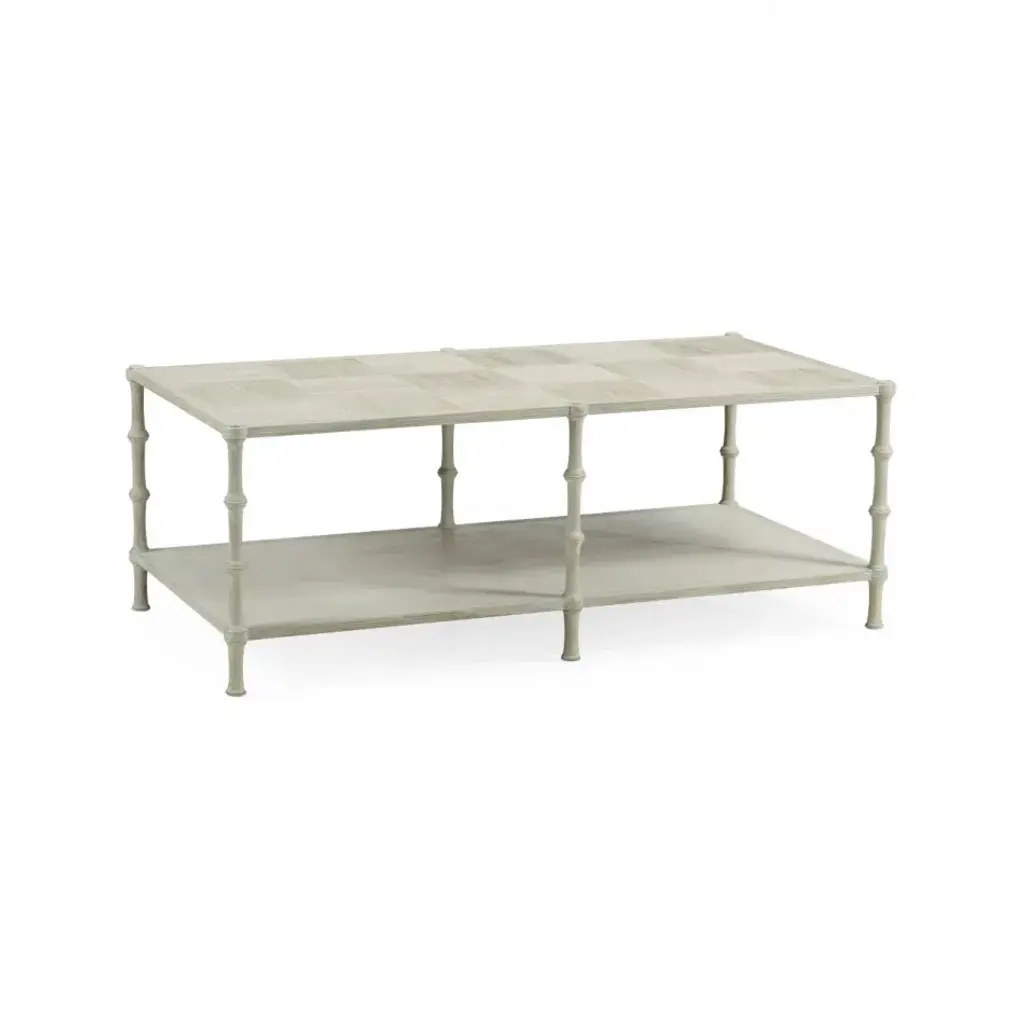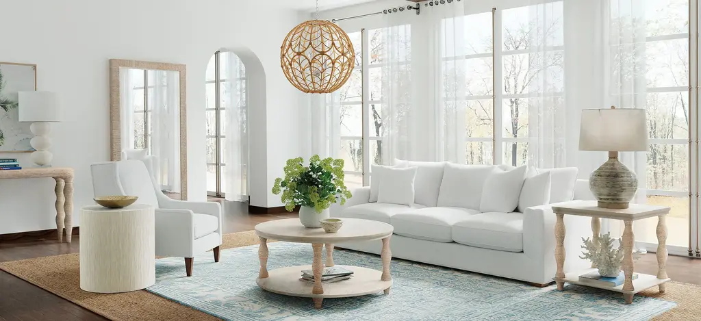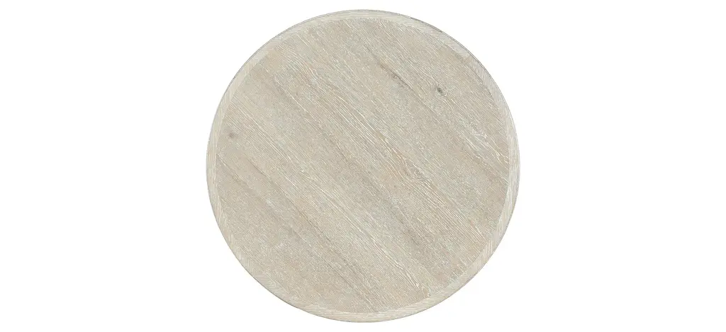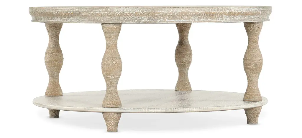 Designed to create a comfortable and inviting retreat within the home, the Bahari Round Cocktail Table is defined by its casual finishes and variety of organic textures and materials that combine to deliver a relaxed aesthetic. Inspired by casual, waterfront living, the collection was designed to bring the relaxed aura of the outside in. White oak veneer delivers two key finishes, a whitewashed look and a weathered gray and is accented with sand blasted pine and soft white bronze metal details. Organic materials including abaca rope that is wrapped around the legs add to its casual style.
