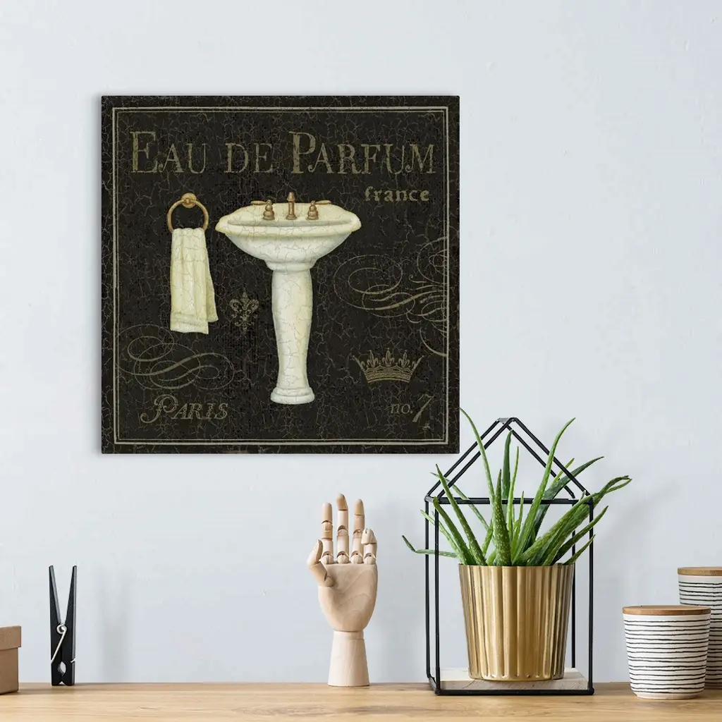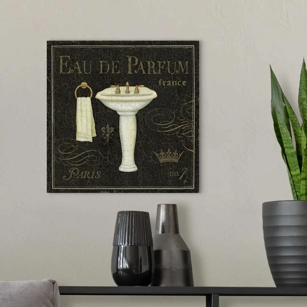 Image of a pedestal sink and ring towel holder with the text "Eau de Parfum."