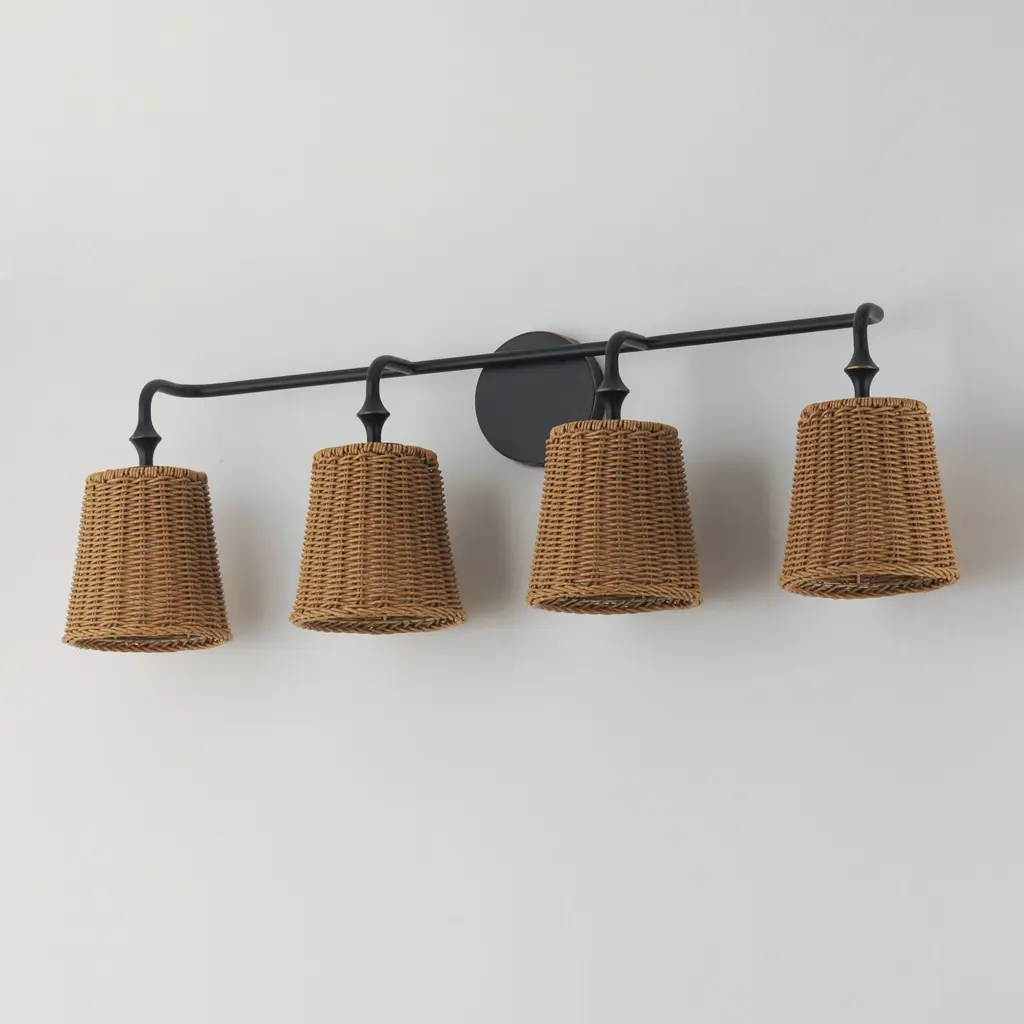 Featuring wicker shades made of synthetic rattan, this bath vanity lighting collection brings an elegant coastal flair to your space. Choose from a Natural wicker finish with a Dark Bronze frame accented by brushed golden highlights, or a Weathered White rattan with a Natural Aged Brass frame for a timelessly elegant composition.