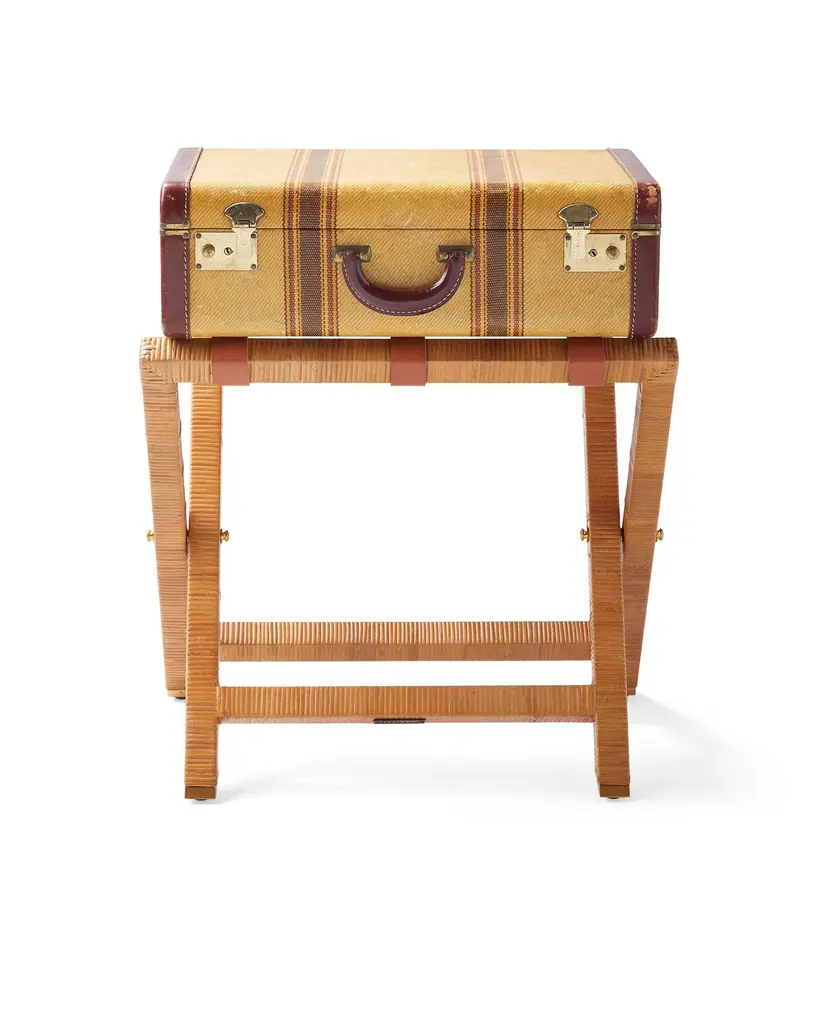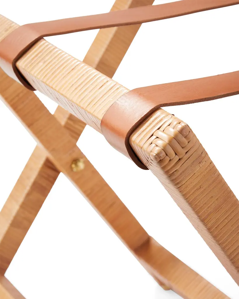 Meet the perfect piece to make your guests feel right at home. The beautiful x-base frame is crafted of solid wood, then hand-wrapped of natural rattan for gorgeous texture and relaxed warmth. Rich Italian leather straps adorn the top, while brass end caps offer a bit of polish. Plus, it folds up easily to be tucked away when not in use.
