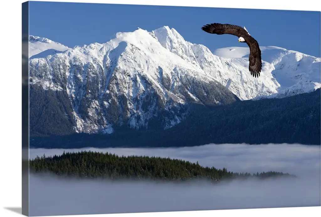 The national bird of prey glides through the air over low hanging clouds passing through snowcapped mountains and trees.