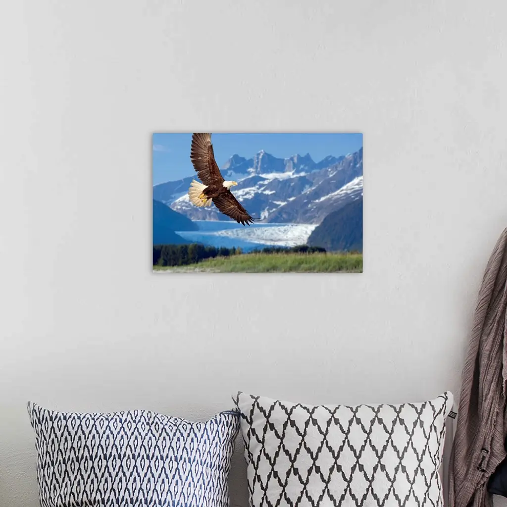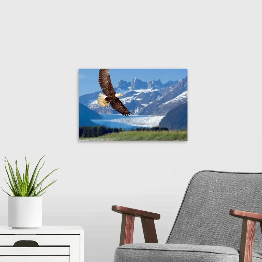Large, horizontal photograph of a bald eagle in flight, in Tongass National Forest, Alaska. Snow covered Mendenhall Glacier in soft focus in the background.