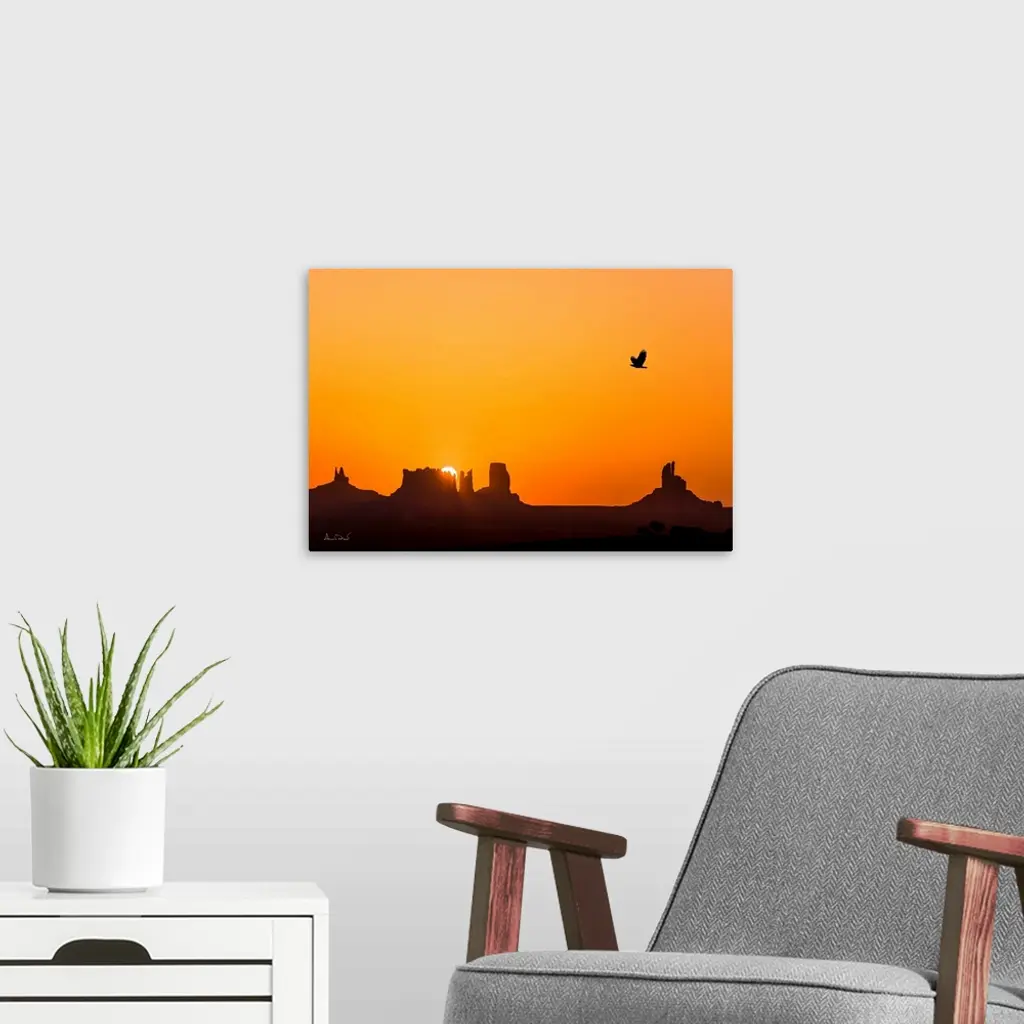 Composite of glorious sunrise over the mittens of Monument Valley with a silhouette of a Bald Eagle, Arizona, USA.