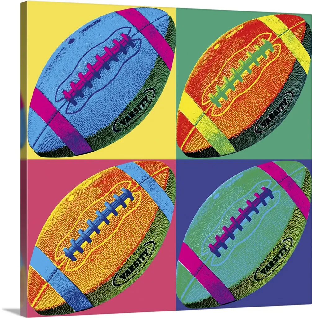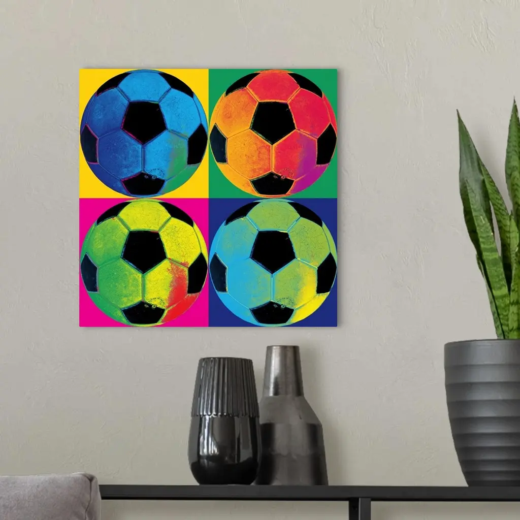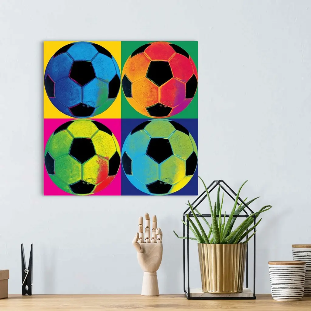 A square canvas of soccer balls of various neon colors in each of the four quadrants with a different color background separating them.