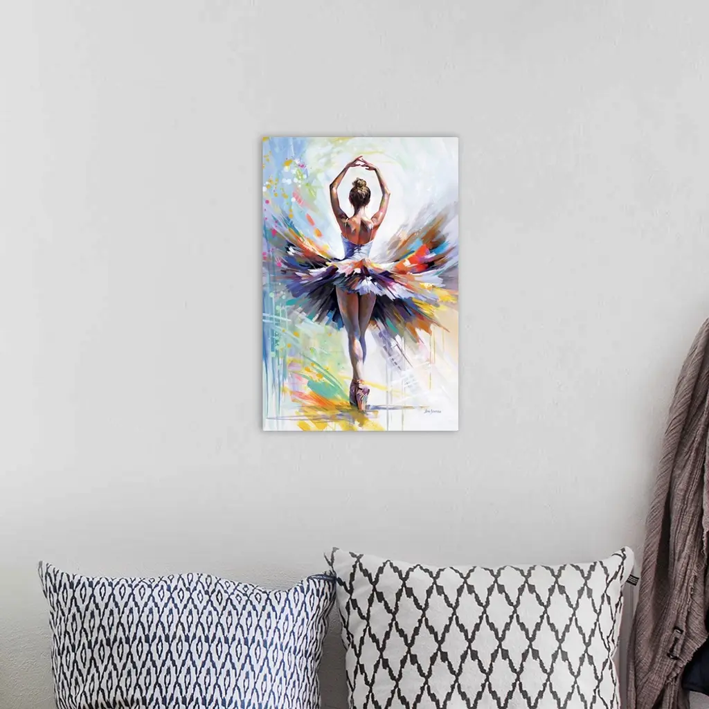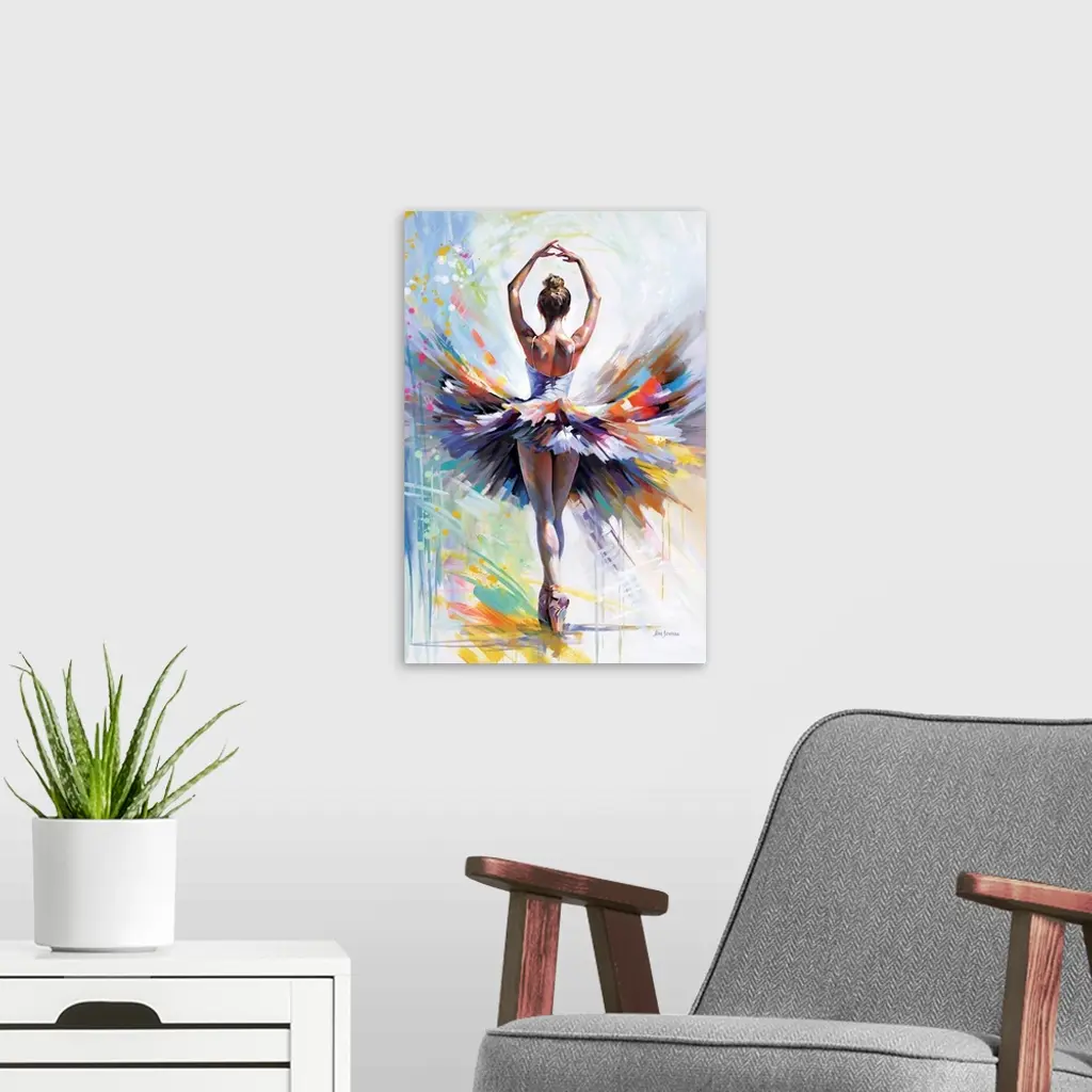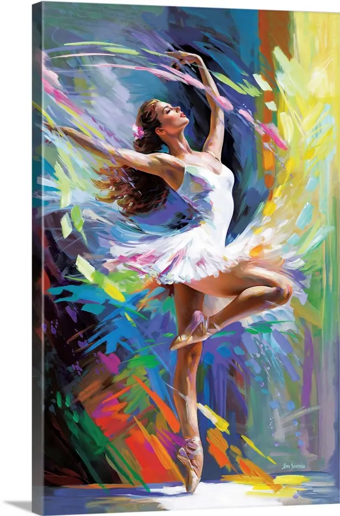 Colorful ballerina standing on pointe with arms gracefully raised, surrounded by vibrant, colorful strokes.