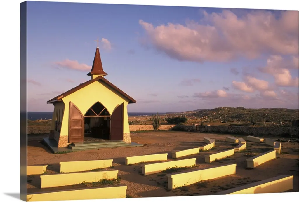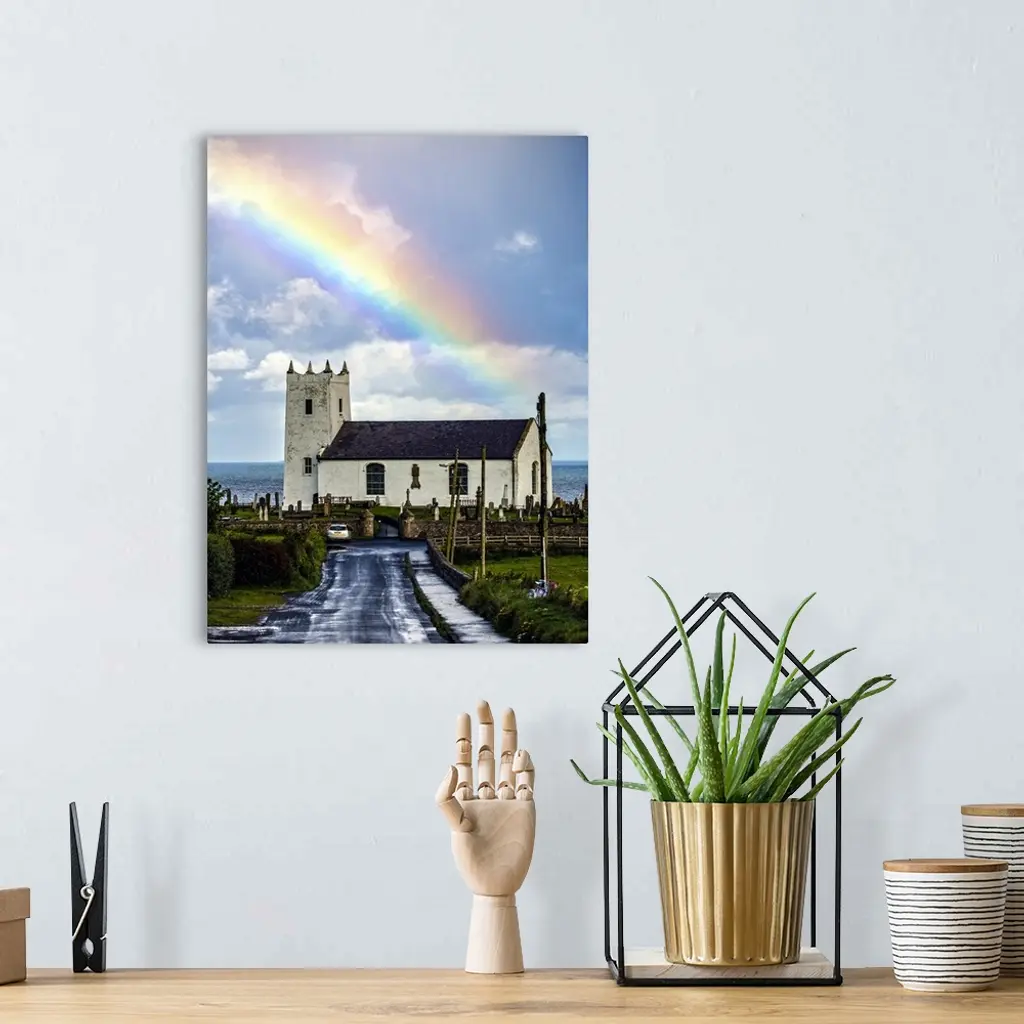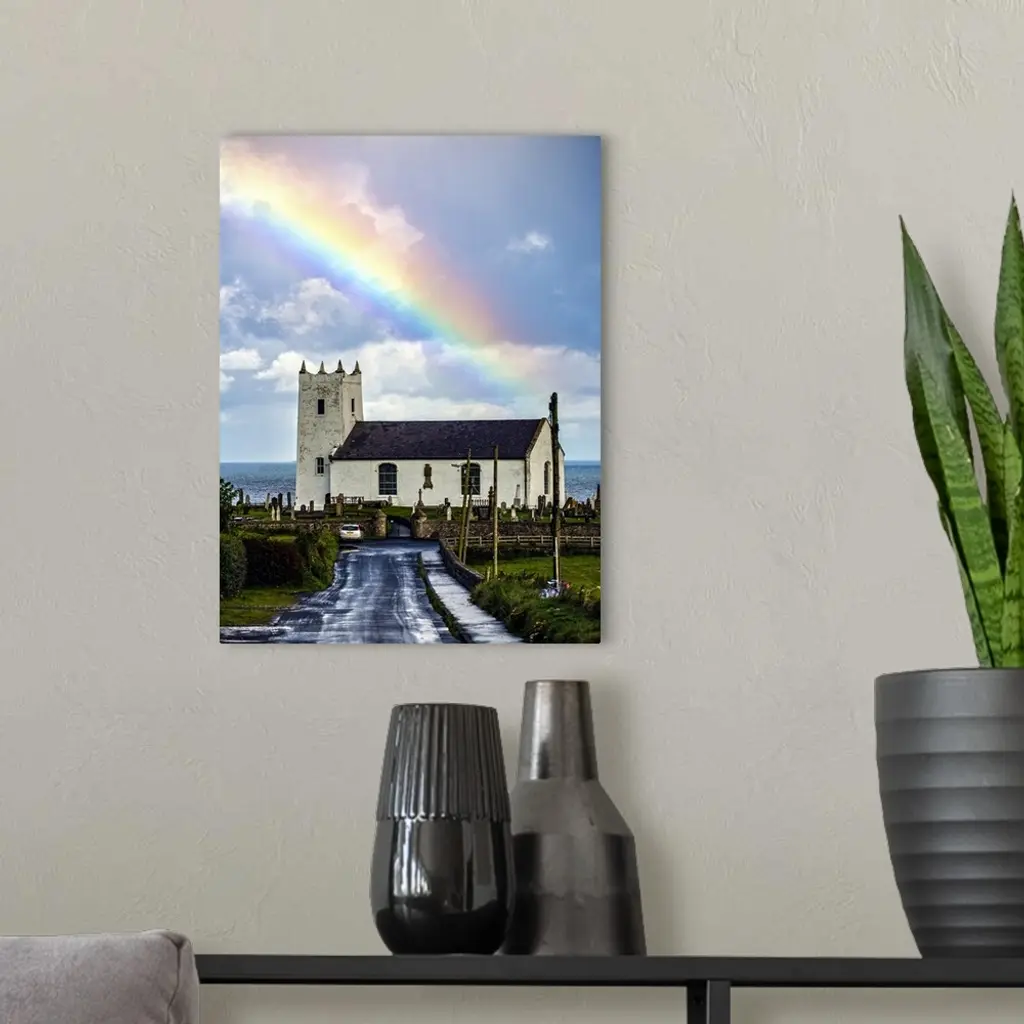 Photograph of Ballintoy Parish Church with a beautiful rainbow behind it over the ocean, at Ballintoy Harbour near Bushmills on County Antrim coast road in Northern Ireland.