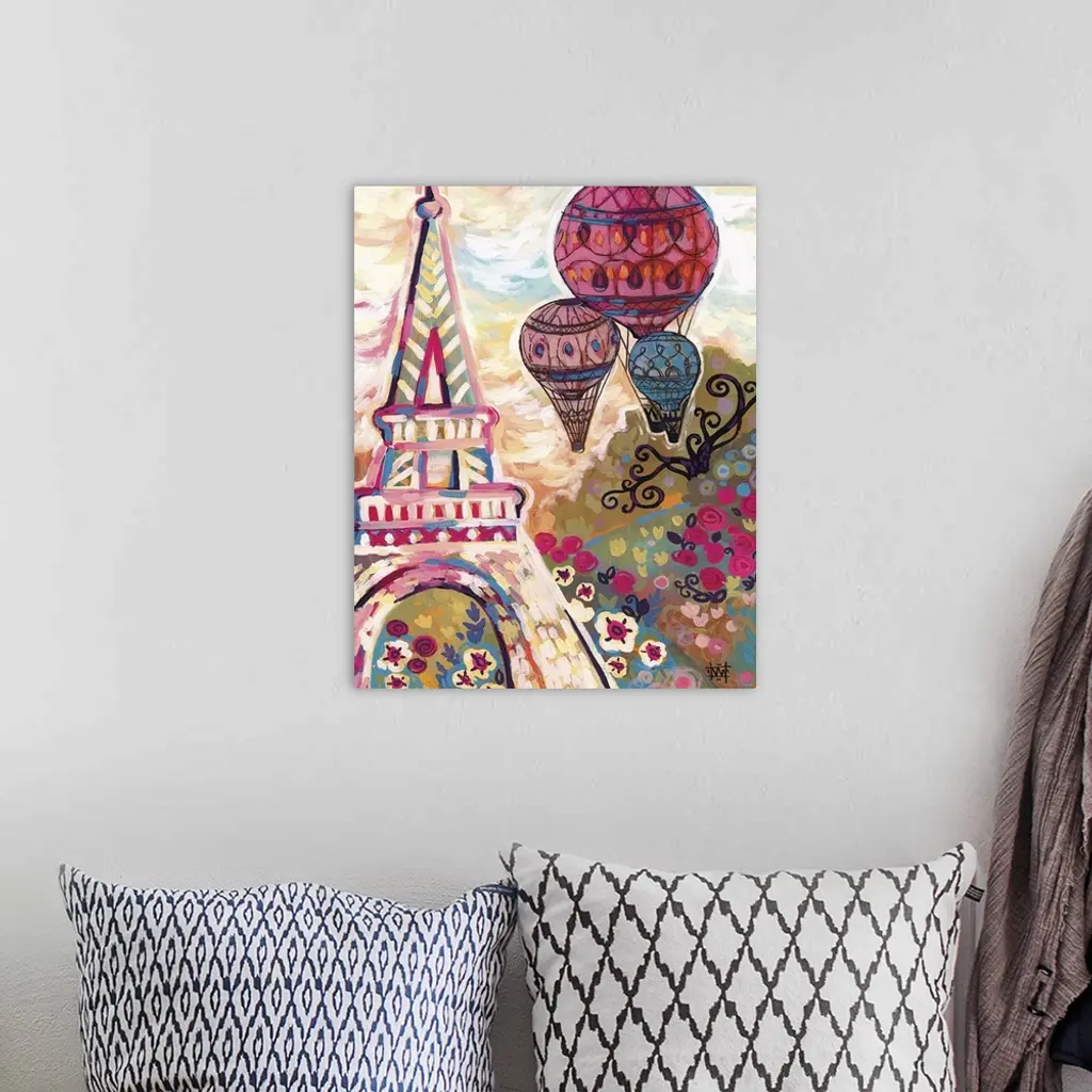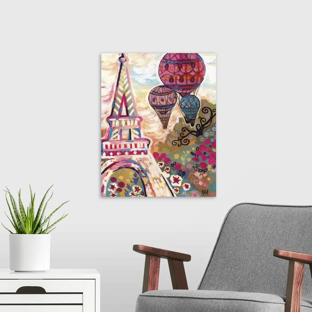 A trio of hot air balloons float over the Eiffel Tower in Paris.