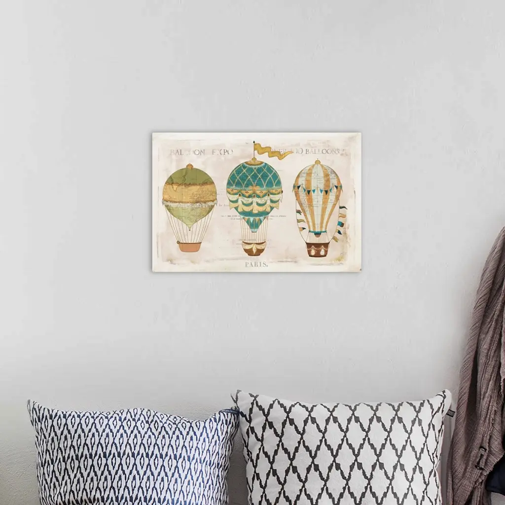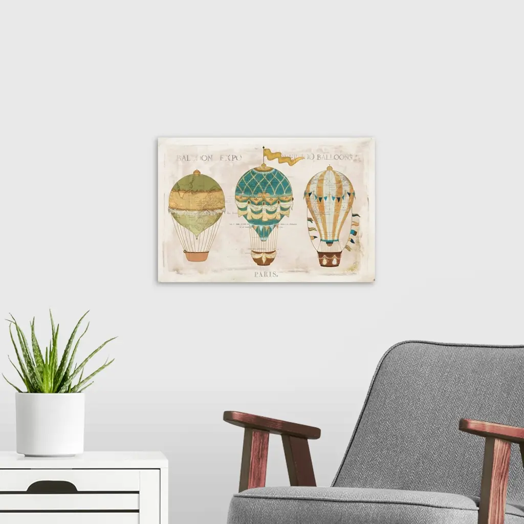 Illustration of colorful hot air balloons on a aged background with a faint map and writing.