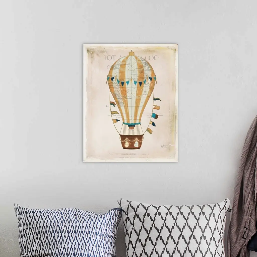 Illustration of a colorful hot air balloon on a aged background with a faint map and writing.