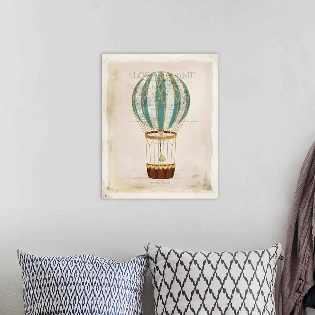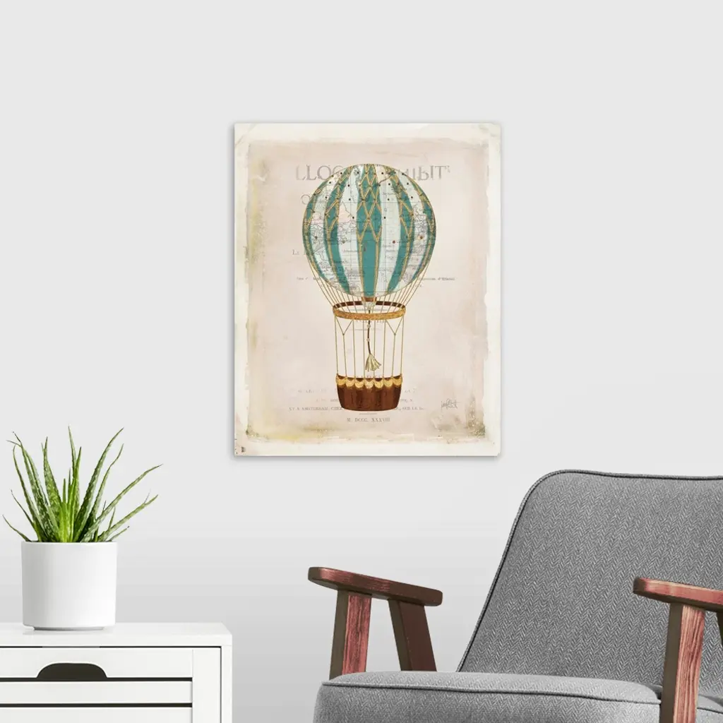 Illustration of a colorful hot air balloon on a aged background with a faint map and writing.