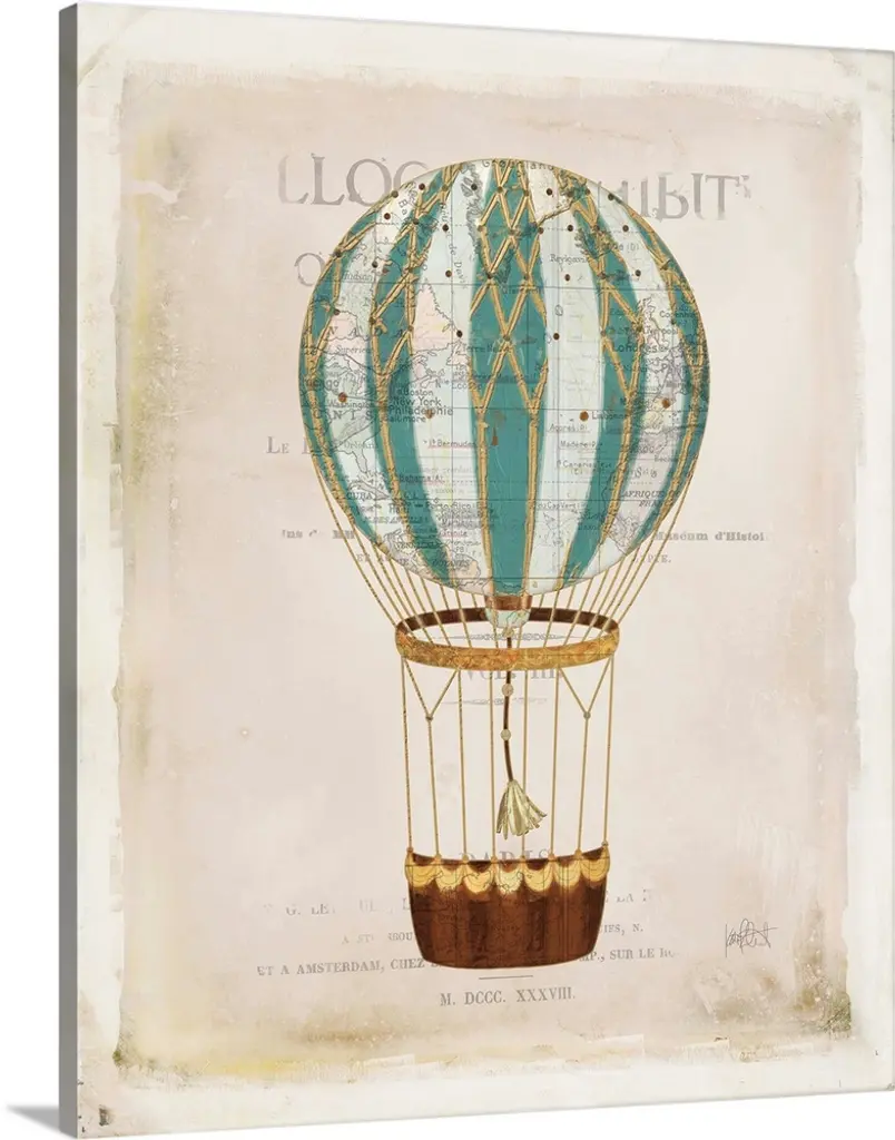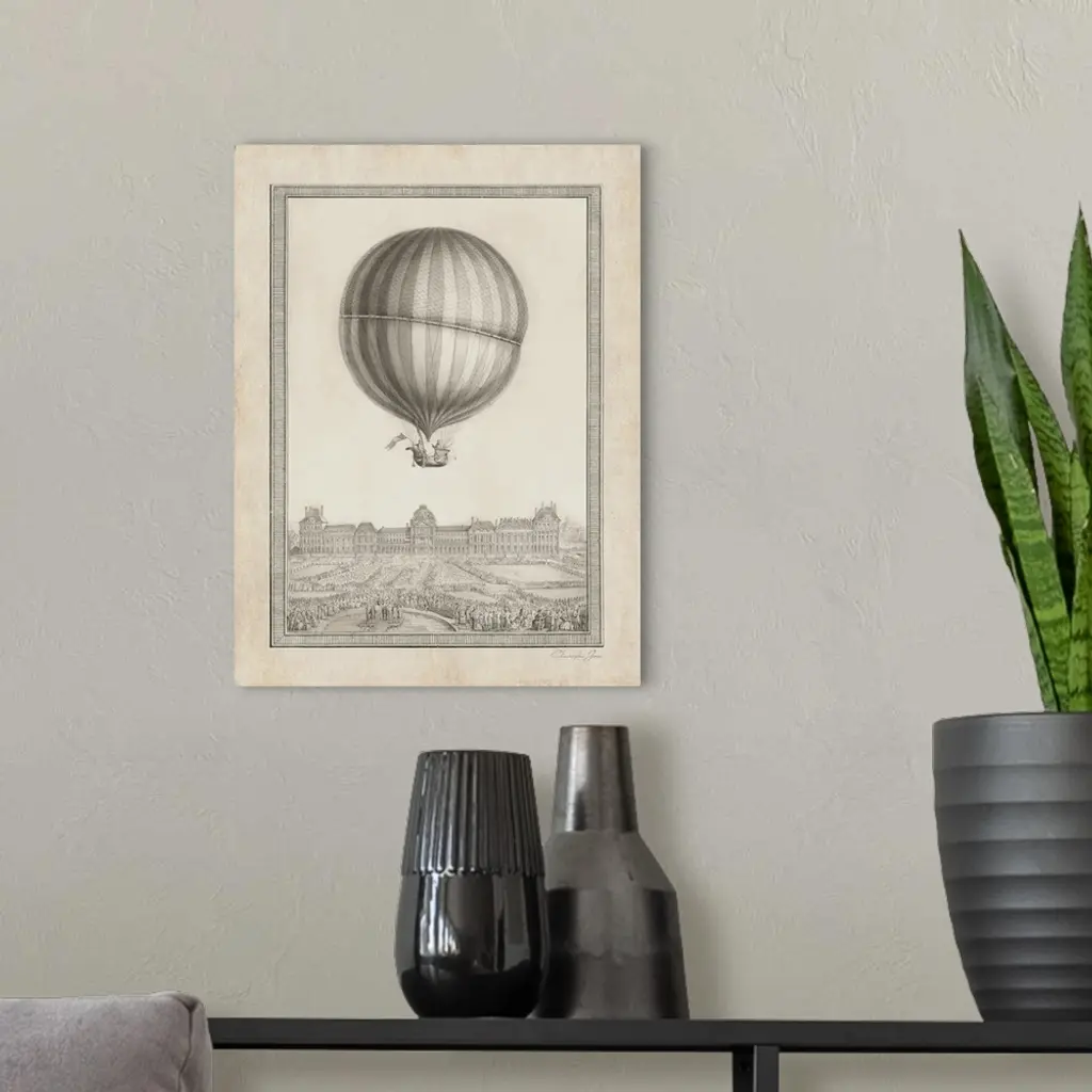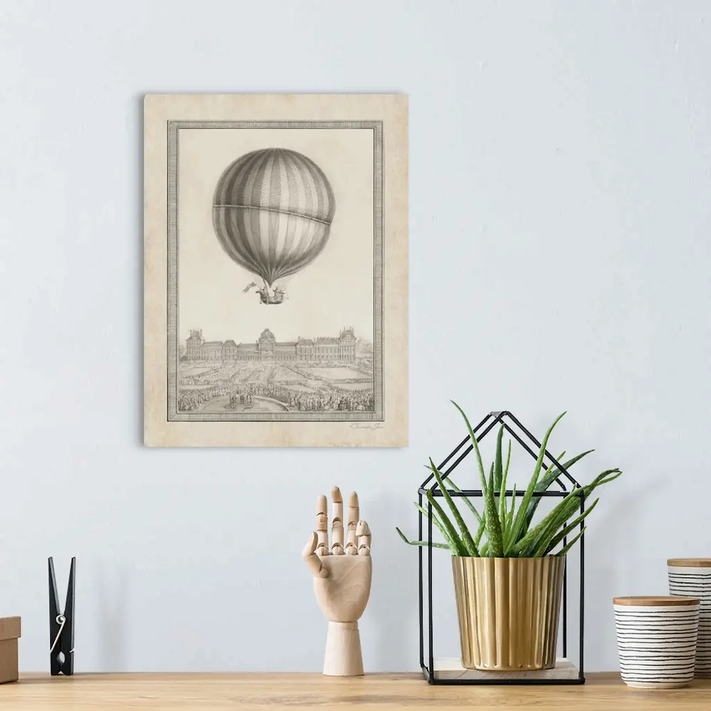 Vintage illustration of a hot air balloon floating above Paris in black, white, and sepia tones.