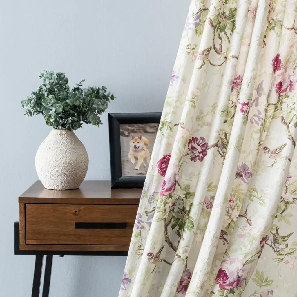 Sheer crushed taffeta and colorful blooms add enchanting texture to your home décor. Like a spring breeze flowing through your home. Sold as a single panel, width measures 48-inches and length measures 63-inches from top stitch down. Constructed with a 1.5-inch rod pocket and a 1.5-inch decorative header. Easy to install only one rod required.