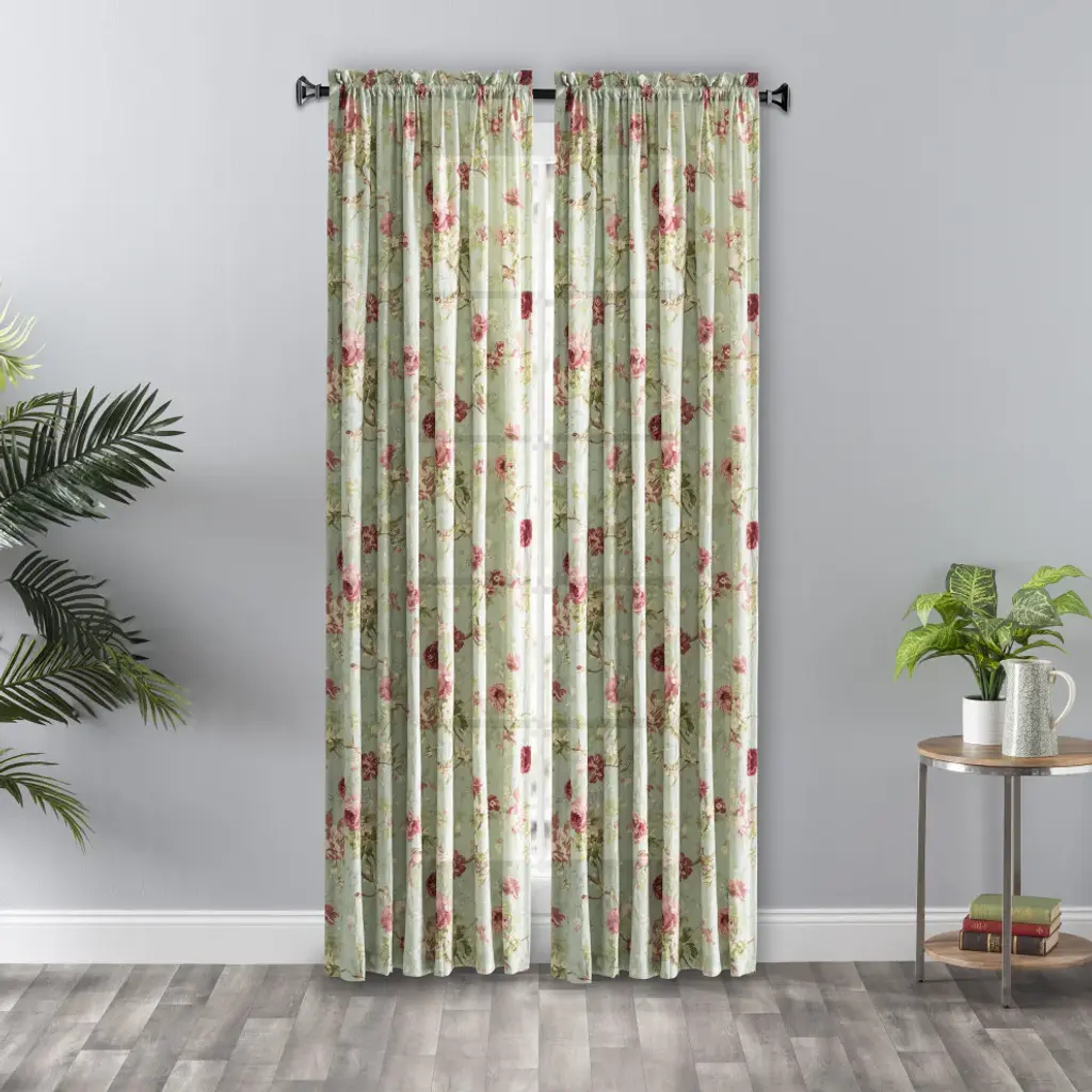 Sheer crushed taffeta and colorful blooms add enchanting texture to your home décor. Like a spring breeze flowing through your home. Sold as a single panel, width measures 48-inches and length measures 84-inches from top stitch down. Constructed with a 1.5-inch rod pocket and a 1.5-inch decorative header. Easy to install only one rod required.