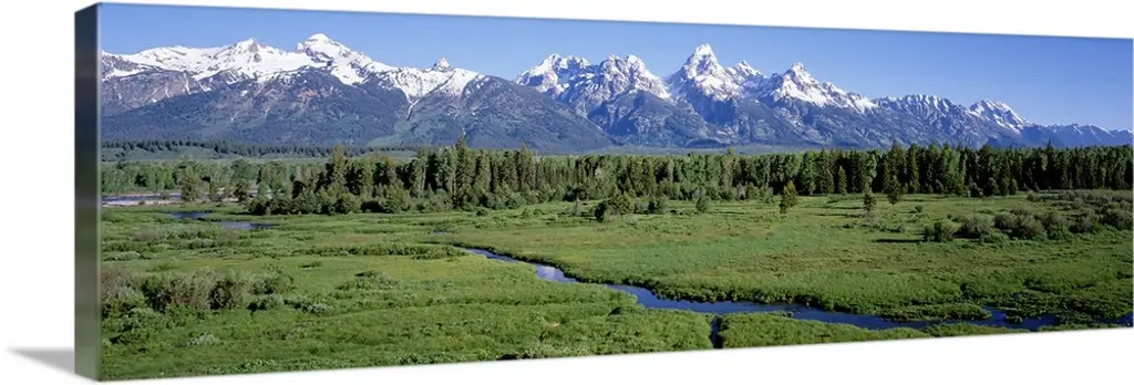 Long horizontal photo on canvas of rugged snow covered mountains in the background of a field.