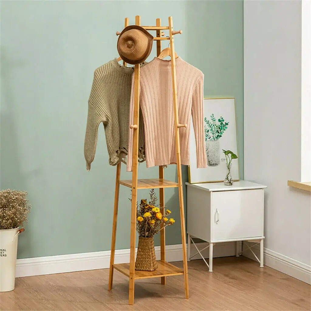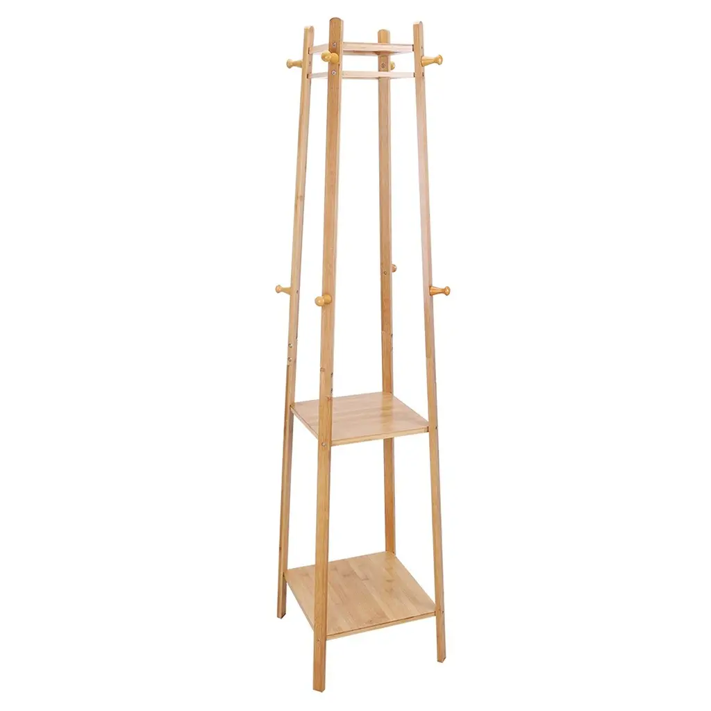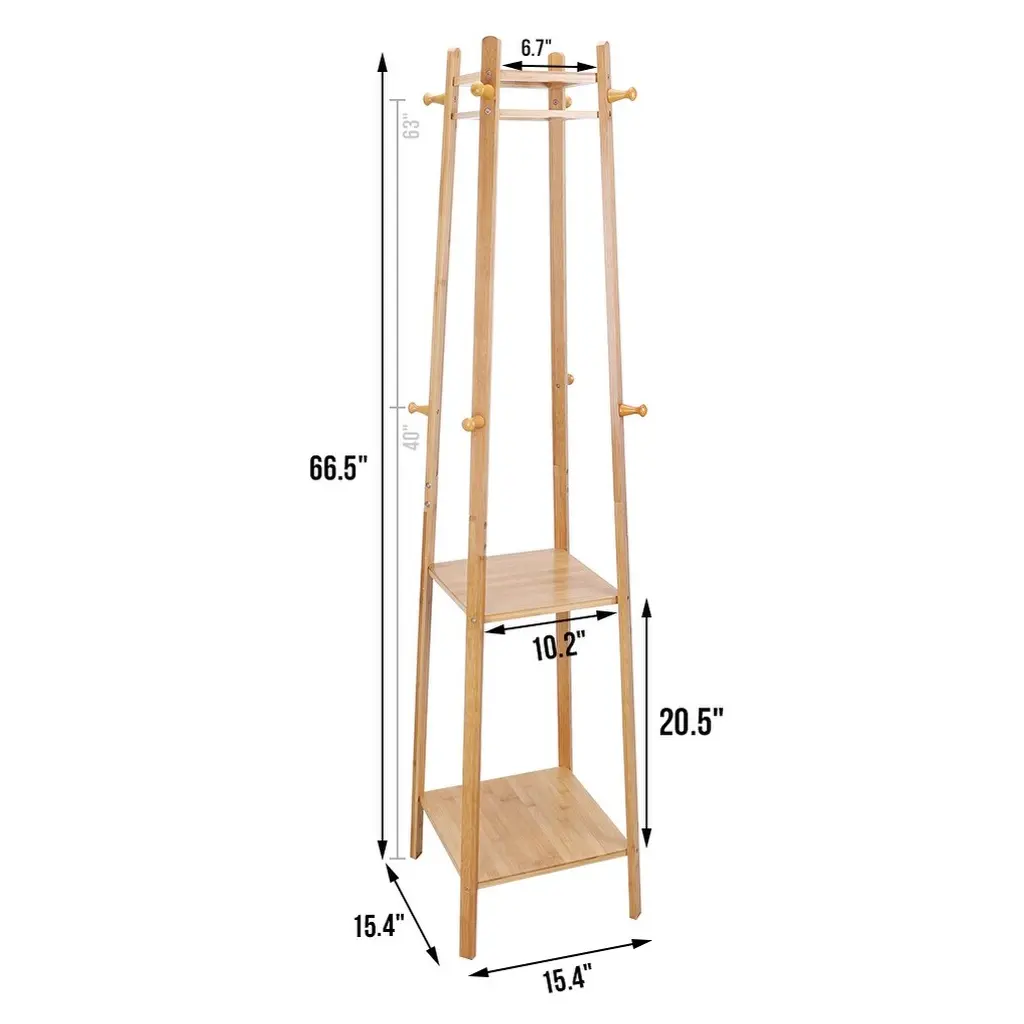 Bamboo Coat Hat Rack Free Clothes Stand Standing With 3 Shelves 8 Hooks - Brown