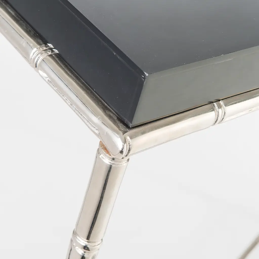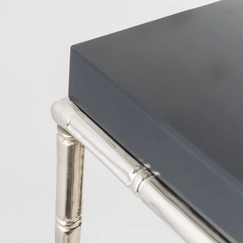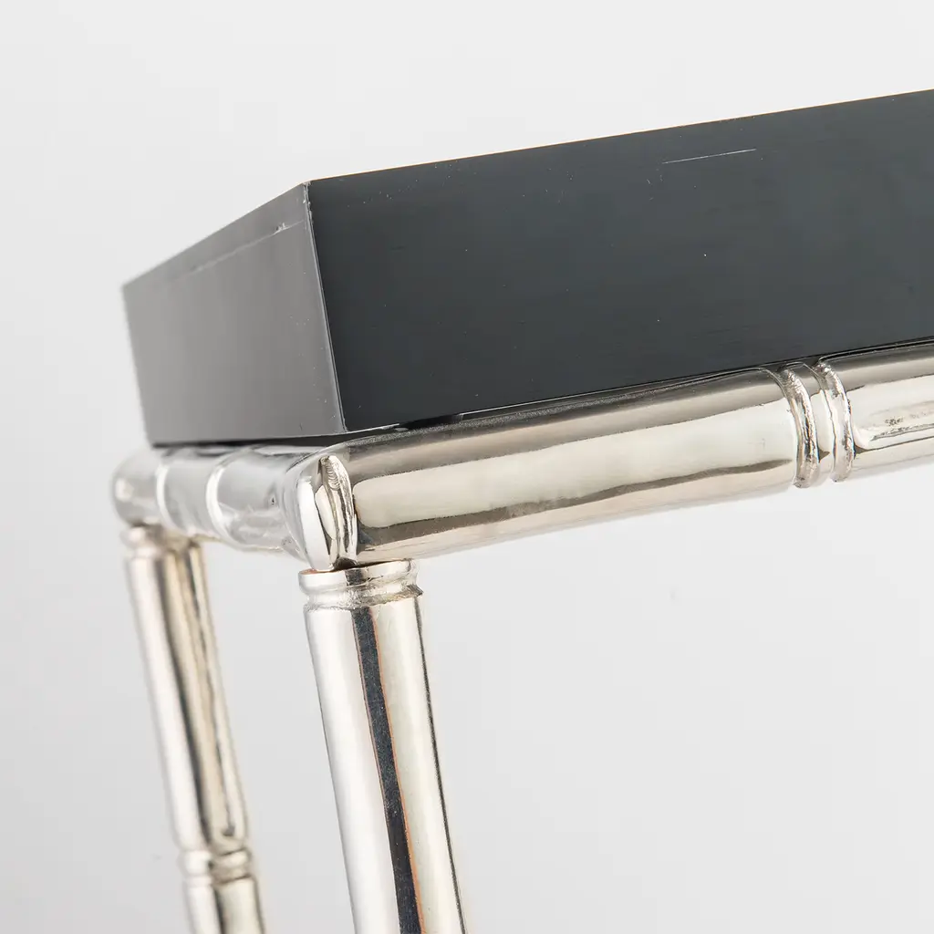 The "Bamboo" console is an elegant piece inspired by the graceful lines of nature. Its frame is entirely handcrafted from polished nickel-plated brass, featuring intricate, hand-engraved details that mimic the texture of bamboo. The console's top is a sleek 4cm thick black plexiglass slab, providing a striking contrast to the warm brass.