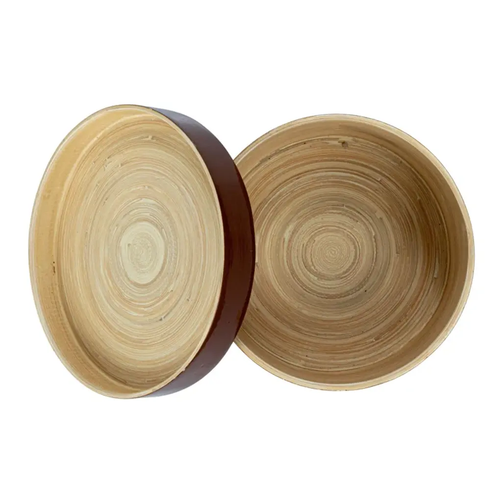 This lacquered bamboo container with lid is a practical and beautiful addition to the kitchen. Made from sustainable, biodegradable natural bamboo, it features a caramel brown color and a glossy lacquer finish. The lid keeps contents fresh and prevents spills, and a small handle makes it easy to lift. The container is round and smooth, perfect for storing small items like spices, herbs, nuts, or candies. It can be used to organize the pantry or present snacks or dips to guests. The container can match various decor styles, creating a cozy atmosphere in the kitchen. This lacquered bamboo container is a great way to enjoy the beauty and functionality of bamboo in the home or a thoughtful gift for those who appreciate natural and elegant products.